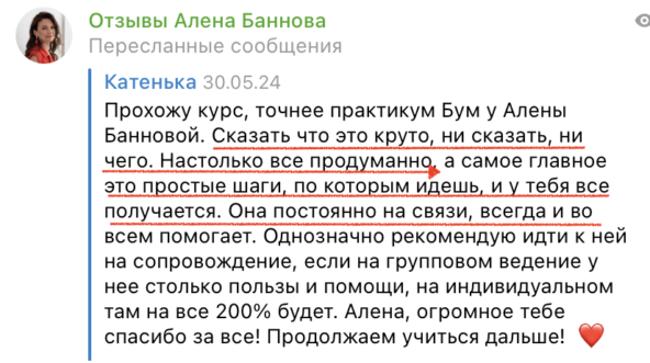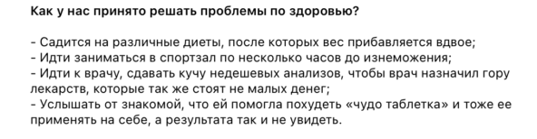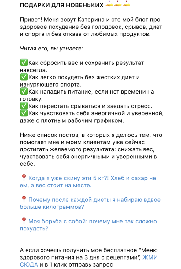 Сначала Катя нашла только поверхностные желания — типа: похудеть, прийти в форму после родов, не сидеть на диетах. Но я понимала, что тогда получится очередной тысячный блог «как у всех». Поэтому мы вместе с ней «копнули глубже». объяснила Кате, почему поверхностных запросов недостаточно и надо копать в глубину В результате получился список из 25 основных желаний и страхов. Мы раскопали, например, что на самом деле люди не хотят никаких диет, считать калории и вот это всё. Им не нравится себя ограничивать, готовить сложные блюда по рецептам нутрициологов, заморачиваться с продуктами. Они хотят прийти, к примеру, на праздник и поесть нормально, винишко себе позволить. Да, они готовы к каким-то шагам, но так, чтобы это не вызывало у них дискомфорта. Их задолбало испытывать голод на диетах. Они устали от постоянных срывов — наедаются и корят себя за это. Осталось соединить эти желания и страхи с контентом в канале. Воронку строили не по принципу «завалю вас полезными постами», а так: «узнаёшь себя в контенте → хочешь разобраться → записываешься на бесплатную консультацию». У Екатерины ещё не было клиентов. Это часто тормозит экспертов — кажется, что без отзывов и результатов никто не поверит в твой метод. Поэтому первым делом, сделали кейсом её саму. Екатерина честно рассказала свою историю: как пришла в нутрициологию, с какими привычками боролась, что пробовала, как изменилась — в теле и самочувствии. Вторым кейсом стал её муж. Чтобы любой незнакомец, который попадает в канал сходу мог понять — что здесь происходит и почему на канал Кати надо подписаться —сделали пост-закреп с удобной навигацией Можно взять эту структуру и использовать для своего блога Из текста понятно, для чего оставаться в канале. Есть магнитные заголовки, по которым интересно перейти. Так человек попадает в контент-воронку, быстро прогревается и готов оставить заявку. Кроме личных историй из Катиной жизни, она писала посты от тех запросов, что раскопали на первом шаге. Поэтому её посты попадали в боли аудитории. Мы не писали: 5 причин пить воду утром. А говорили: Едите втихаря ночью и потом ругаете себя. А утром снова обещаете начать «новую жизнь». Человек читал и думал — да, это про меня. И это срабатывало лучше обычных полезных постов. Часть продающего поста, который мы выстроили на основе самых насущных потребностей и показали, что с Катей можно по-другому 5. Первые подписчики и первые продажи Как привлекали подписчиков: — приглашали из других соцсетей в постах и сториз — оформили аккаунт на Авито и во всех диалогах давали ссылку на телеграм-канал — я нашла для Кати клуб с женской аудиторией и она договорилась о том, чтобы выступить там как спикер с темой про правильное питание. Предварительно мы с Катей потренировали продажи в переписках и на созвоне. Я объяснила, как построить диалог, чтобы расположить человека и продавать без втюхивания, а из позиции «я помогаю клиенту решить его проблему». За 4 недели работы Катя с нуля оформила канал, вырастила его до 62 подписчиков и смогла сделать первую продажу и взять в месячное сопровождение первого клиента! Считаю, что для новичка в профессии и для человека, который никогда не вел свой профессиональный блог — это Вау результат. Лично мне в начале пути понадобилось сильно больше времени, пока я разобралась как работают со