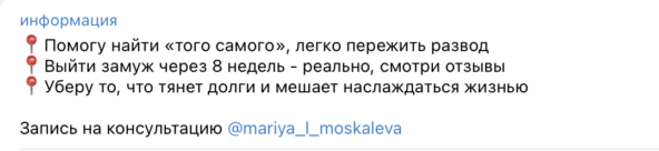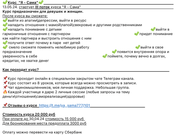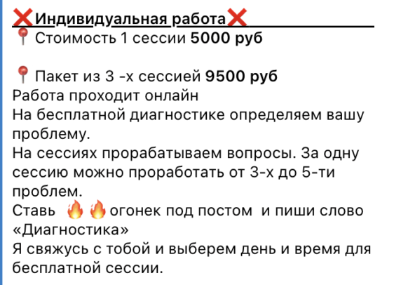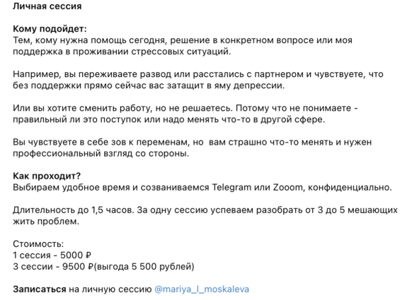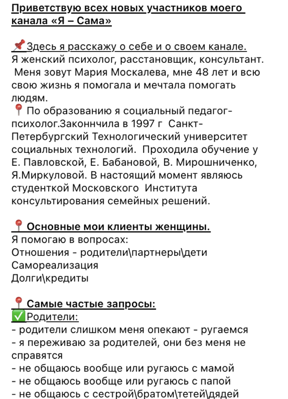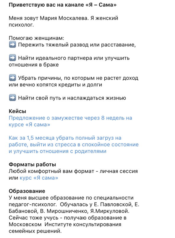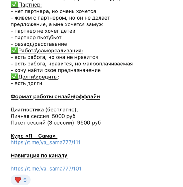 На аватарке стильная, ухоженная дама, фото сделано профессионально и производит приятное впечатление даже на незнакомого человека. Название сразу дает отстройку — что это женский психолог, а не для всех подряд, поэтому ок. Было Стало Убрала апатии, депрессии и чувства вины — потому что с такими запросами работать тяжелее всего. Денег у таких клиентов тоже обычно с гулькин нос, и фраза «Научу» как бы сразу стопорит клиента — да не хочу я ничему учиться, я хочу результаты! Добавила в первую очередь те запросы, с которыми чаще всего приходят клиенты — а это разводы и отношения. Их и «повесила на флаг». Тем более, что в этой сфере у Марии есть реально классные результаты — после 2х месяцев работы клиентке сделали предложение, надо это транслировать. Добавила внятный призыв на консультацию вместо «написать лично». У Марии был закреп, но несколько хаотичный, не хватало выгод для потенциального клиента или подписчика. Когда запускаем рекламу и незнакомые люди начинают приходить в блог, они хотят увидеть структурированную полезную информацию в одном месте. Я переделала пост-закреп: Было: Стало: Убрала длиннющий список запросов, чтобы человек не уснул при перечислении всего что было. Оставила основные, самые популярные запросы, с которыми работает Мария. Дополнила пост навигацией и добавила ссылки на полезные посты и кейсы, сделала магнитные заголовки для них. Добавила форматы работы ссылкой на отдельный пост, чтобы не «кидать» в незнакомца просто название формата и цену. Сократила инфу об образовании, но оставила самую важную часть, чтобы было ясно, что у Марии есть профильное высшее образование. Убрала ссылку на отдельный пост с навигацией, чтобы у подписчиков не дергался глаз от перепрыгиваний от одного поста с навигацией к другому. Чтобы все самое важное было в ОДНОМ закрепе. Вот так выглядели посты, в которых «продавалась» личная сессия и курс. Не донесена ценность — а за что платить, собственно. Вот как я переделала эти посты. Запись на личную сессию. Сразу понятно, для кого и в каких случаях подходит формат работы, как проходит и как вообще записаться без закидывания огоньков в комменты. А так переделала пост-продажник для курса. Сделала его по структуре: Боль + мотивация к решению боли + желаемый результат + способ достижения результата + кейсы + призыв к действию. В итоге вышла грамотная подача материала и канал, на который хочется подписаться. Есть еще над чем работать, потому что весь остальной контент тоже надо перелопачивать — начинать от выгод клиента, а не просто из головы. Этим мы с Марией тоже займемся в личной работе, чтобы доносить до новых подписчиков ценность своего продукта. А вот и отзыв хозяйки канала на переупаковку продающих постов. Если хотите так же, то приходите ко мне в личную работу — там упакуем ваш канал и настроим на него поток подписчиков и клиентов. Пишите мне в https://t.me/alenabannova — познакомимся и я расскажу подробнее про форматы работы. А еще можно подписаться на мой Телеграм-канал, там периодически тоже разбираю посты в блогах, провожу эфиры про продажи в соцсетях и делюсь своими наработками по продвижению в Телеграм.