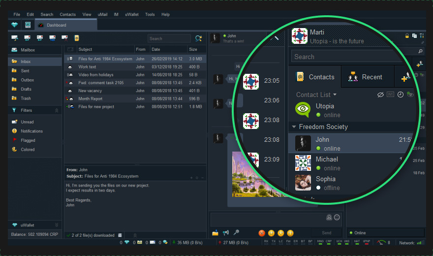 Используя Utopia, вы можете отправлять личные сообщения или частичные сообщения в групповом чате, отправлять внутренний uMail (вид электронной почты, используемый внутри экосистемы), отправлять голосовые сообщения, делиться файлами с друзьями, совершать финансовые транзакции, выраженные в нашей собственной криптовалюте под названием Crypton. Все это в полной конфиденциальности. Более того, используя Utopia, вы будете зарабатывать Cryptons с помощью процесса, называемого майнингом, который не замедляет работу вашего компьютера. Нет ничего более приятного, чем использовать любимое программное обеспечение и зарабатывать одновременно. Каждый пользователь участвует в передаче сетевых данных, но только получатель может расшифровать данные. Усовершенствованное шифрование обеспечивает защищенный от перехвата канал связи для всех пользователей Utopia. Весь связь защищенный и защищены высокоскоростной криптографией с эллиптической кривой Curve25519, а локальное хранилище зашифровано 256-битным AES. Большой Брат больше не смотрит за тебя! CRYPTON CRYPTOCURRENCY Криптон является неотъемлемой частью системы утопии. Все финансовые операции в Утопии выражены в Криптоне. Криптографически безопасный. Не может манипулировать организацией или правительством Сейф для торговцев. Транзакции в Crypton являются окончательными и не могут быть отменены Интерфейс продавца легко доступен Свобода оплаты. Отправляйте и получайте деньги в любую точку мира в любое время Вы контролируете свои деньги. Там нет третьей стороны с правом заблокировать ваш кошелек Конфиденциальный. Ваши транзакции не могут быть просмотрены другими Экономически эффективным. Вы можете зарабатывать, просто используя Utopia, не влияя на производительность вашего компьютера. После регистрации на https://u.is/en вам необходимо скачать приложение Utopia. После установки программы вам будет присвоен идентификатор оборудования и закрытый ключ, эти ключи необходимы для активации вашей лицензии, которую можно сделать на странице активации. Помните, что ваши учетные данные для входа на веб-сайт портала не связанные с приложением Utopia, и у вас может быть другое имя пользователя для приложения. После активации лицензии ваш аккаунт утопии будет связан с вашим аккаунтом портала. Пошаговая процедура для легкого понимания процедуры активации: uMail — безопасная альтернатива классическому электронном письму. uMail можно прислать пользователям Utopia, которые сейчас есть в вашем списке контактов. uMail имеет всю функциональность электронной почты, локализованной в экосистеме Utopia. Ни один сервер не используется для передачи или хранения почты. Аккаунт uMail, создается автоматически при присоединении к сети Utopia, позволяет неограниченно сохранять сообщения и вложения. Шифрование экосистемы Utopia гарантирует безопасность передачи и хранения почты. Ваше электронное письмо, как внутренняя часть Утопии, не может быть заблокирован или удален. Компания Utopia представила uNS (Utopia Naming System), которая является уникальной системой имен и независимой от обычной системы имен домена. DNS подвергается давлению и цензуре со стороны международных законов. Домены могут быть отозваны или приостановлены по нескольким причинам, как неответу на запрос WhoIS или иная политика реестра, невыплата, государственные действия и т. uNS, наоборот, — это действительно децент