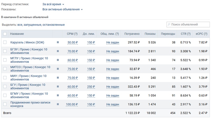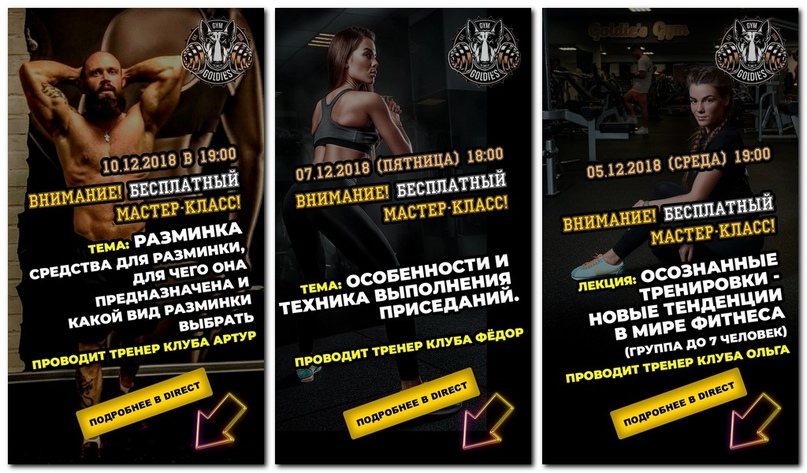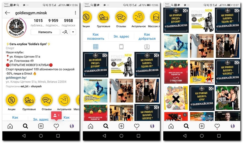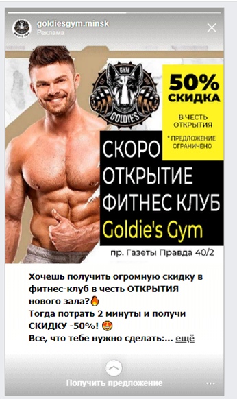 Был проанализирован бюджет конкурса и аудитория, которой будет интересен розыгрыш.Анализ показал, что можно работать сразу в нескольких направлениях — учащиеся университетов, конкуренты и это стало решающим фактором.Было создано несколько рекламных объявлений, направленных на продвижение, чтобы охватить всю аудиторию, которая была ранее выделена. До нашего сотрудничества за две недели был получен охват 8 000 просмотров,благодаря разработанной концепции охват с 25.09 по 27.09 увеличился до 17 656 ,что превышает показатели втрое. За два дня в группу ВК: — вступило больше 130 человек; — было совершенно 458 перехода; — общий CTR 2.522%; — общая средняя стоимость перехода 2.47 рубля; — было потрачено 1 122 рубля. Аккаунт поступил к нам в плохо-оформленном состоянии: — краткое описание; — отсутствовал контент-план; — посты выкладывались хаотично по времени; — не применялся единый стиль в оформлении постов. Мы создали концепцию оформления аккаунтов: Сделали аккаунт в фирменном стиле, чтобы новый подписчик, даже не читая описания, понял, что это аккаунт фитнес-клуба. Посты выкладываются регулярно каждый день. Новое оформление аккаунта вInstagram. Были оформлен Highlights для быстрого доступа к полезной и актуальной информации. Контент-план был составлен нами так, чтобы подписчик видел не только фотографии зала, но и познакомился с тренерами клуба, получил информацию о правилах выполнения упражнений, сбалансированном рационе питания и много другой полезной информации. За 5 месяцев нашей работы было создано 80 постов. Мы использовали в продвижении видео с тренерами, чтобы посетителям было комфортнее приходить в зал. Знакомство с персоналом начинается как только человек подписывается на профиль в Instagram и Вконтакте. Для увеличения продаж абонементов и лояльности к клубу, каждые две недели проводятся акции и конкурсы. Включили обязательные stories каждый день в Instagram. В результате увеличилась активность, люди стали интересоваться аккаунтом. 4 февраля открытие нового клуба Goldie’s Gym. Было оформлено продвижение Вконтакте. Было создано 9 объявлений, из которых 4 оказались наиболее продающими. Была создана форма заявок вконтакте в прикрепленном посте, чтобы охватить больше аудитории. Статистика, одного из объявлений приносящих заявки в новый клуб. В результате РК Вконтакте: — было потрачено 3 885.06 рублей на таргетированную рекламу; Для продвижения была настроена реклама в instagram. В результате таргетинговой рекламы в instagram — всего на рекламу потрачено 4 810 рублей; — цена за одного покупателя абонемента 22,44 рубля; — 91 человек оформили заявку на абонемент; — количество человек перешедших по рекламной ссылке в stories 798 человек; — рекламная компания охватила 78 796 человек; — Общая сумма заявок: 1 137 500 рублей. Общая сумма заявок от рекламы на открытие третьего клуба, за две недели до начала работы клуба составила 2 137 500 рублей. Все акции проводимые фитнес-клубом настраиваются в рекламном кабинете для увеличения продаж. Каждая запущенная акция настраивается таким образом, чтобы был максимальный охват аудитории при минимальных затрат: — Охват пользователей по акции о тренировки составил 46 335 человек; — 316 человек перешли в профиль фитнес клуба и подали заявку для участия в акции; — всего на рекламу было потрачено 2 925 рублей; — цена за одного нового посетителя клуба составляет всег