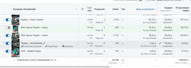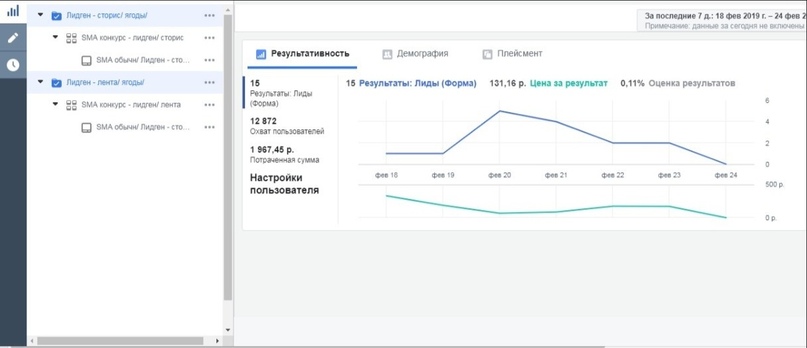 В таргетинге была протестирована аудитории: — Гео по Москве — Местные жители — Интересы бизнес, инвестирование, вложения в бизнес. Сузили — интересы фрукты, путешествия, туризм. И еще раз сузили — вовлеченные покупатели, онлайн-покупки. Далее каждую неделю клиент получал по 15 заявок, что было превышением назначенного количества. Из 15 лидов 10 становились теплыми (готовыми к покупке). Также в директе обрабатывались заявки, в неделю было по 5 заявок, что очень хорошо для премиум сегмента при низких бюджетах. На скрине можно увидеть, что цена лида = 131,16р при цене продукта более 5000 вполне оправдывает себя. Месячный бюджет составлял 20 000р. (На скринах старт работы). Суммарно получили более 60 лидов и 50 обращений в Директ в премиум сегменте. Также во время работы мы установили CRM систему, чтобы упростить обработку заявок как на лидогенерации, так и сообщения в директ.