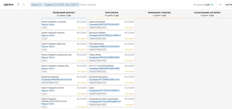 Так же, статистика первичных обращений по АmoCRM. В силу того, что все было интегрировано с аккаунтом, обращения, которые оставляли в директ дублировались сюда: