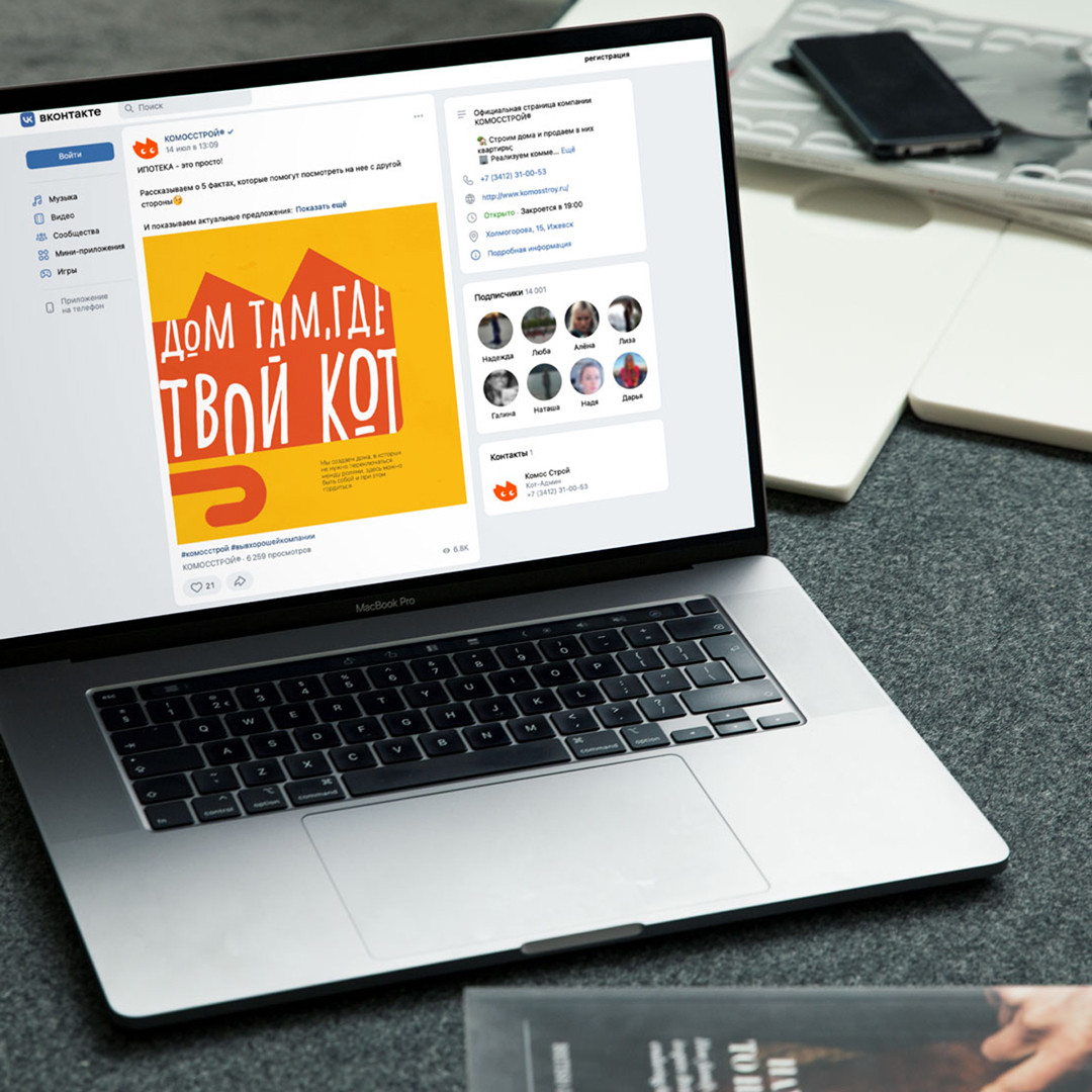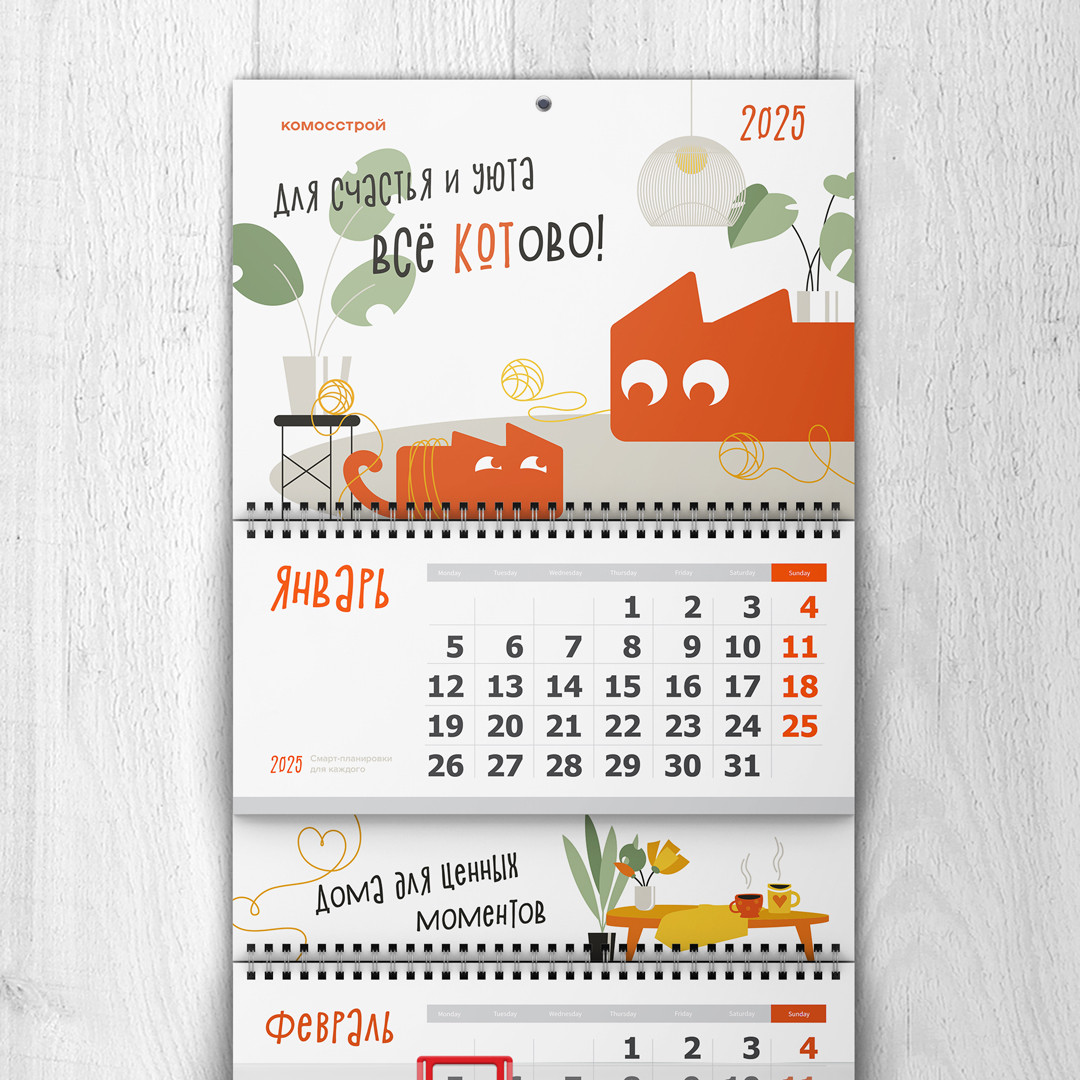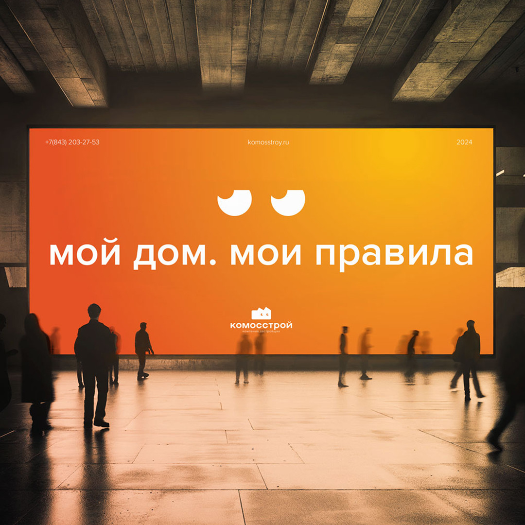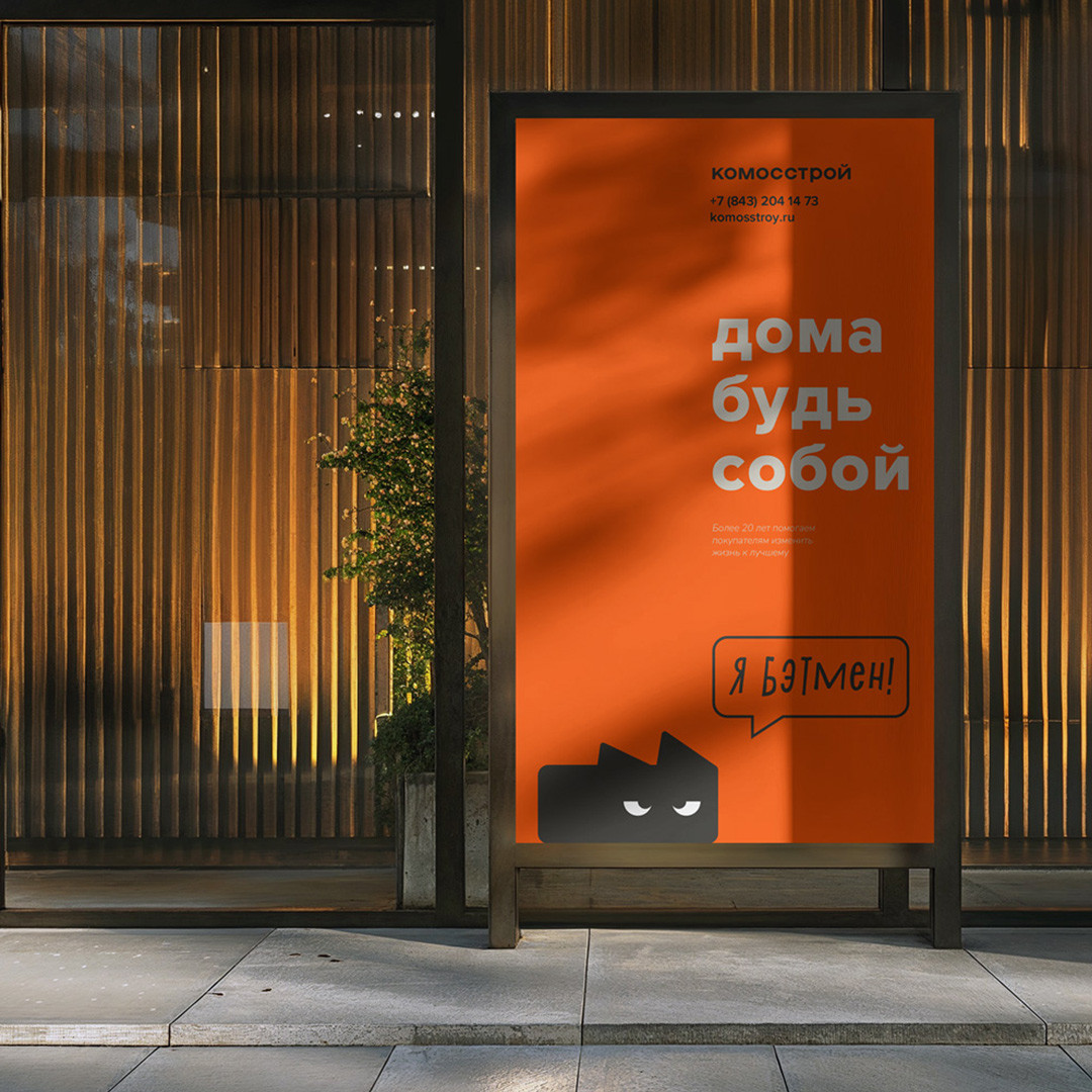 Tаким образом, новый бренд КОМОССТРОЙ® дает ответы на запросы аудитории: понимая и принимая их, создавая условия не просто для покупки квартиры, а для проживания моментов счастья, мягко помогая в выборе, предлагая варианты без навязывания и разрешая противоречия, строя комфортные и красивые дома. Позиционирующей идеей стало лаконичное и искреннее «Строим для тех, кто строит свое собственное счастье». Идеи близости к аудитории, дома, спокойствия и самодостаточности нашли отражение в понятном каждому символе... и домашнем любимце — рыжем коте, который уютно устроился в знаке застройщика, принимая форму кирпича. А его уши напоминают силуэты крыш. Знак не статичен — он реагирует на настроение аудитории: тоже способен радоваться, удивляться и даже злиться. Это передает «человечность» бренда — он такой же, как мы. Буквы в фирменном знаке также стали дружелюбными и мягкими, из типографики ушел формализм, и появилась эмоция. Согревающий, приветливый и оптимистичный оранжевый — цвет спокойной радости, домашнего очага и уверенности в себе — пришел на смену строгому и холодному темно-красному оттенку.