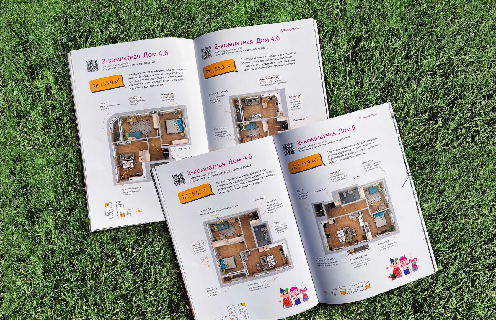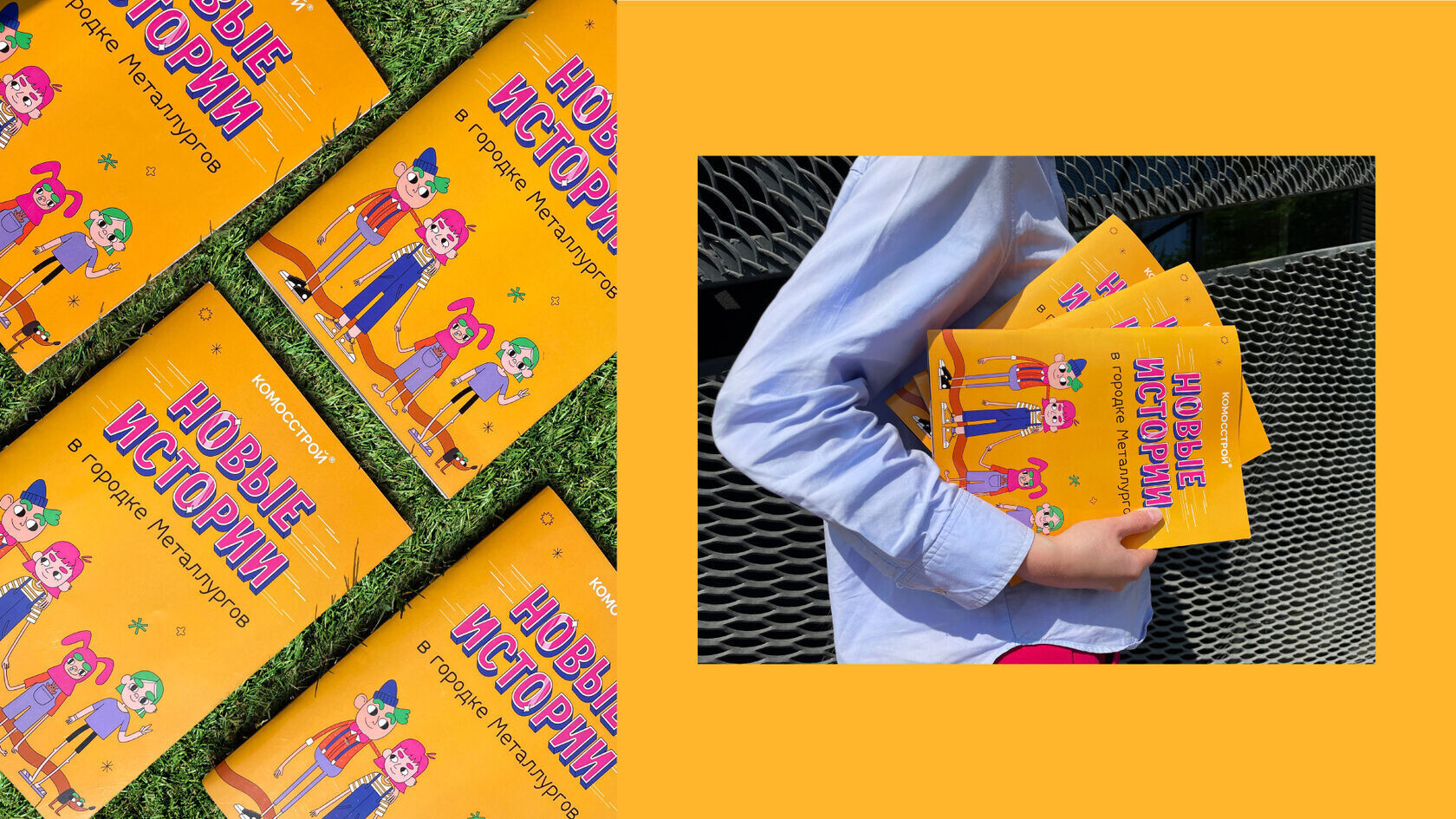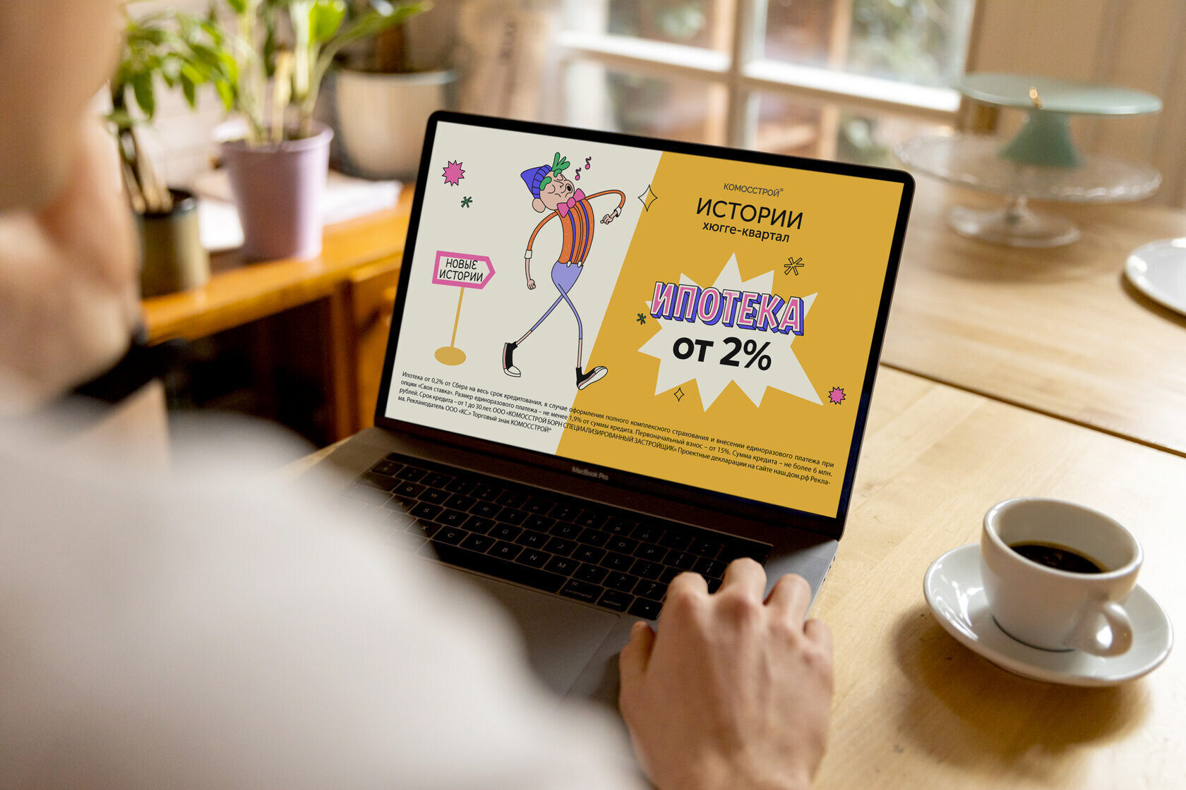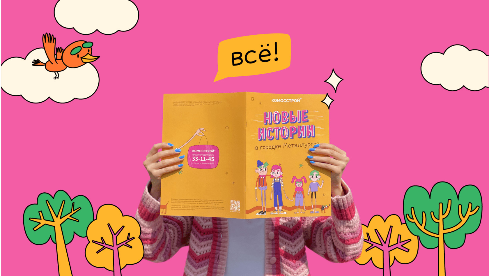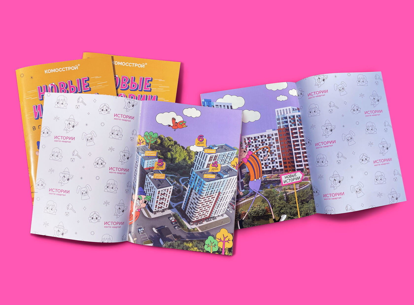 Младшие представители семейства — это нагловатый подросток и маленькая девочка в забавной шапке. Длинная такса (не захотелось ли вам пропеть заставку «Котопса»?) и характерный рыжий кот отлично дополняют эту компанию. Новые образы используются на сайте жилого комплекса, диджитал-баннерах, в буклетах и оформлении демоэтажа. Буклет мы сделали интерактивным, добавив раскраску для детей. Рендеры «оживили», соединив с иллюстрациями, а жизненные сюжеты будущих покупателей раскрыли через маленькие истории семьи Дрюгге, уже ставшей такой «своей». Даже планировки в буклете можно показать через эмоцию. Мы предложили написать свою историю в новом доме: вот тут можно отпраздновать новоселье, тут — устроить веселые старты, а здесь — сделать маску, пока ребенок купается... «КОМОССТРОЙ», Заказчик: «Тринадцатый» предложил много творческих концепций, среди которых был яркий, простой и добродушный паренек со своей Историей. Вдохновленный на новую жизнь Мистер Дрюгге, со счастливой розововолосой женой, чудесными детьми и собакеном-сосиской, попал нам в самое сердечко. Это был исторический момент! Теперь комикс в дудл-арт стилистике, разбавленный поэтичными историями семьи Дрюгге, очаровывает клиентов и заставляет их не просто улыбнуться, а купить билет в счастливую жизнь в новых «Историях».