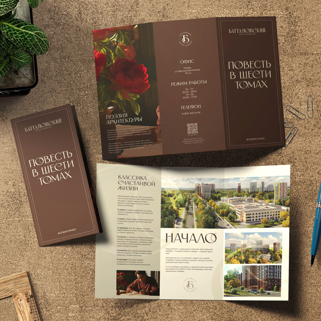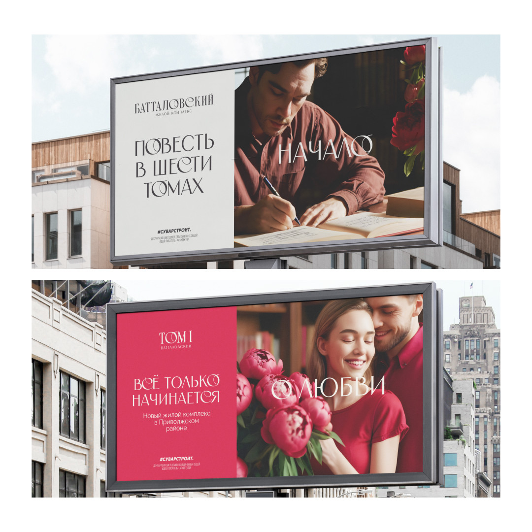 «Батталовский» — это классика счастливой жизни, которая никогда не выйдет из моды. Переплетение разных историй, которые охватывают не одно поколение. Возводя дома, кирпич за кирпичом, авторы «Батталовского» строят новый комфорт, пишут историю района строка за строкой, слог за слогом. Уверенный, надежный, обаятельный — таким становится «Батталовский». Мы вовлекаем в захватывающий сюжет и играем авторской интонацией. А визуальные образы писательства дополняют характер, создают преемственность литературы и архитектуры. Думая над названием очередей, мы заметили, как созвучны слова «дом» и «том». «Всё начинается с любви», — писал поэт Роберт Рождественский, поэтому мы решили начать с тома «О любви», а затем продолжить историю: «О семье», «О гармонии», «О счастье», «О расцвете», «О наследии». У нас появилась идея объединить эти тома циклом «Батталовские повести», но было решено оставить название «Батталовский»: оно проще в использовании, легко запоминается. Однако первоначальная идея сохранилась и раскрылась в коммуникации. Элегантный, но современный логотип на основе каллиграфического шрифта с засечками отсылает к оформлению книг. Элементы, напоминающие росчерк пера, и архитектурные пропорции делают его классическим, но актуальным. Фирменные цвета вдохновлены архитектурой «Батталовского» и дополняются уникальной для каждой очереди палитрой. Текстурность и тактильность в визуальном стиле создают ощущение, словно находишься в домашней библиотеке, где каждая книга имеет свою историю и напоминает о чем-то. Вместо стандартного «Старт продаж» начать рекламную кампанию мы решили так, будто анонсируем первое издание книги: «Батталовский. Повесть в шести томах. Начало». Эмоционально и немного интригующе. А следующим этапом становится выход тома «О любви». О любви, с которой всё начинается. Нам было очень приятно, что «Суварстроит» оказались так же влюблены в литературную тематику, как и мы. Клиент поделился с нами видео с праздничной презентации проекта. В оформлении даже использовались строчки стихотворений Салиха Баттала, ставшие для нас эпиграфом к многотомному изданию повестей. Уверены, эта поэтичная история будет продолжаться еще не один год! Сделано в «Тринадцатом»