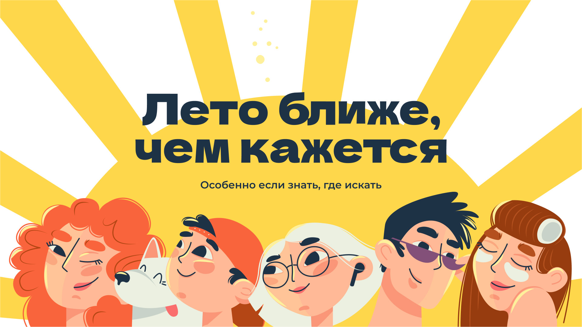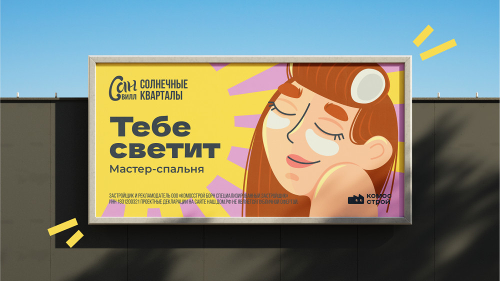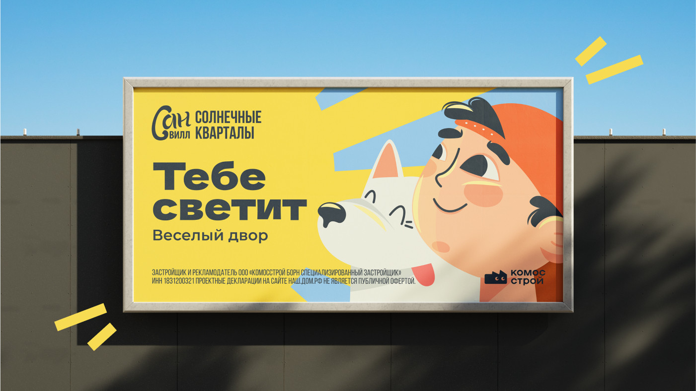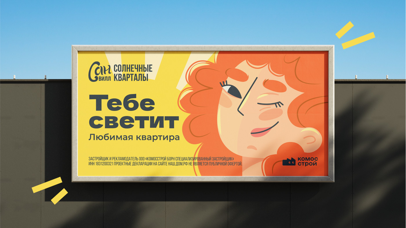 В попытках «переосмыслить солнце» мы предложили три креативные концепции.Первая обращалась к хиппи-стилистике как к символу свободы, легкости и жизни под открытым небом, но были сомнения, что тема Вудстока не будет близка ижевчанам. Вторая идея раскрывала солнце через стилистику славянских нарядных, даже немного ярмарочных образов — вроде хорошо, но опять же есть сомнения, что тема «русскости» уже немного начинает надоедать, нет... В итоге остановились на варианте, где солнце становится главным героем коммуникации, заполняя собой все пространство, а «диалог» ведется от лица жителей кварталов, обласканных теплыми лучами.Персонажи в стилистике флэт-иллюстраций: обаятельный мужчина в солнечных очках, едва проснувшаяся красотка в бигуди, озорной мальчишка — легкие и радостные, они будто говорят: «А жить и правда хорошо!». Наши партнеры — люди неравнодушные и максимально вовлеченные в процесс, поэтому отрисовка персонажей делается буквально совместно. Цвет волос, фигура и даже порода собаки — здесь каждый штрих имеет значение. И вот уже Никитос, огненная Марго, Настя, Алинка и Святослав принимают солнечные ванны на билбордах города: солнечно, дерзко, запоминаемо. Мария Максачёва, маркетолог КОМОССТРОЙ: Персонажи и слоган «Тебе светит!» так цепляют, что сразу становится как-то светлее на душе. Яркая и позитивная реклама говорит: «Здесь не только квартиры, а целая атмосфера счастья»! Сделано в «Тринадцатом»