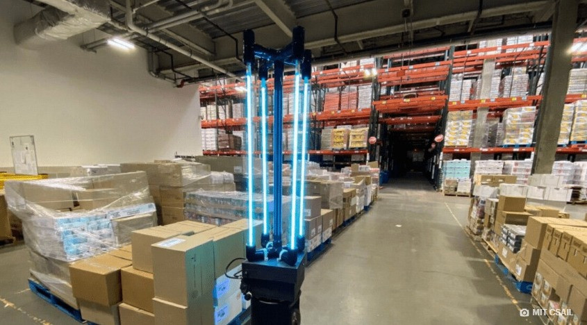 Массачусетский технологический институт (MIT) представил робота, который использует ультрафиолетовый свет для уничтожения коронавируса. Такой робот может быть использован для дезинфекции складов, школ и офисов.