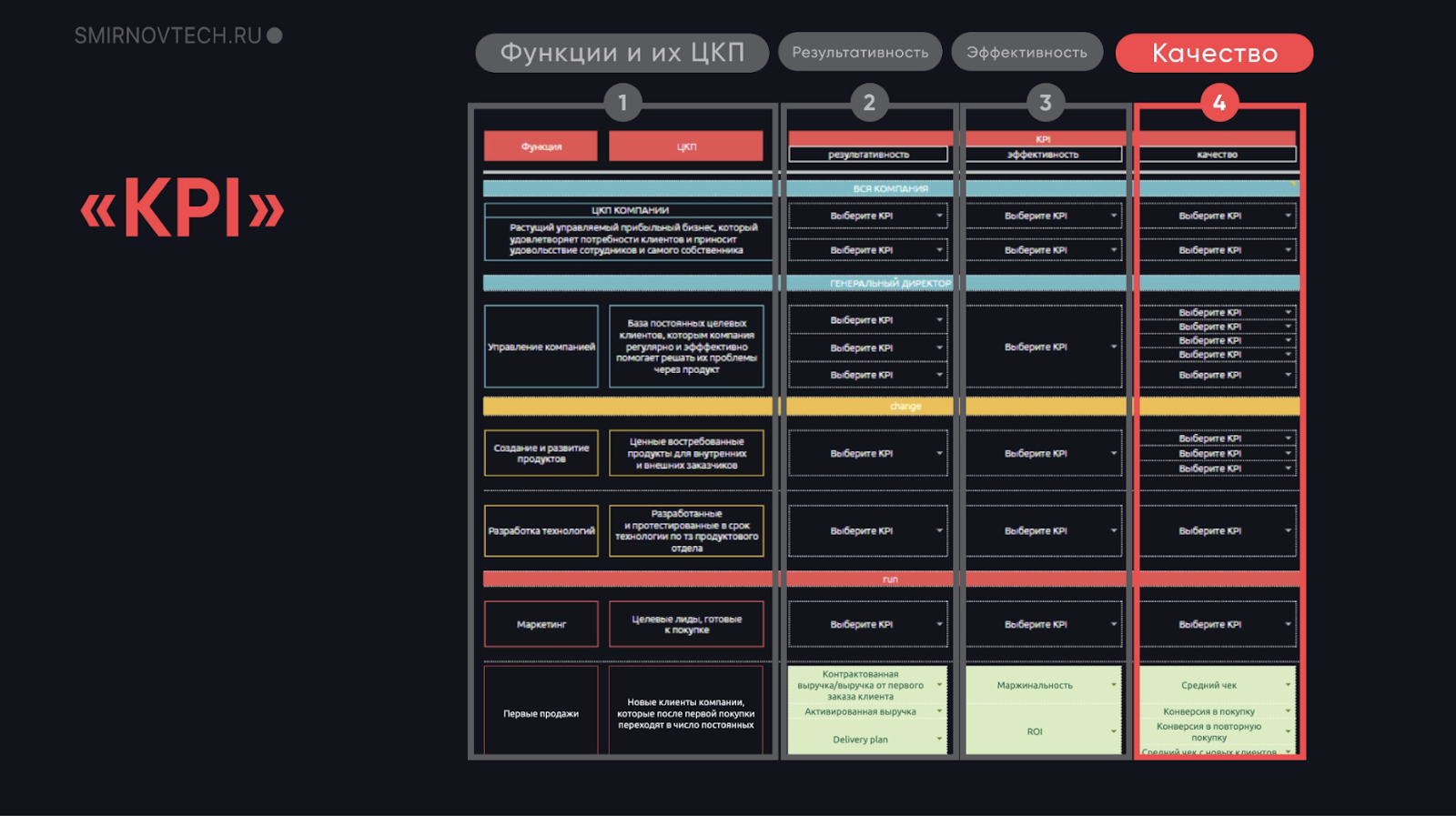 Вот представьте, что по такому принципу мы описываем все 13 функций, они минимум превращаются в 39 KPI. Компания становится прозрачной и управляемой, как на ладони.