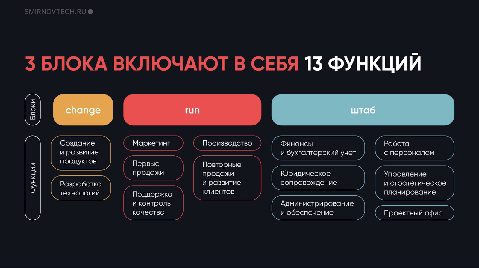 Подушка безопасности. Представим, вы передали бизнес топ-менеджменту. Очевидно, что они будут ошибаться. Очевидно, что им нужно учиться, чтобы стать самостоятельными. А без ошибок это сделать невозможно. На такой переходный период я советую заложить подушку безопасности на 3–6 месяцев. Иначе собственнику придётся постоянно перекрывать кассовые разрывы и регулярно возвращаться в операционку. P&L. Планируйте расходы и доходы на каждый месяц с учётом сезонности, проектов, масштабирования и спадов. Затем назначайте ответственных, которые будут сокращать разрыв между планом и фактом и держать руку на пульсе. Я делаю это с помощью 2 инструментов: декомпозиции и дашборда. Декомпозиция. Проведите эксперимент. Если вы подойдёте к своим сотрудникам и спросите, какая цель у компании на этот год, как много из них ответят точно? Если большинство ответят верно, значит, всё отлично. Но зачастую больше половины коллег не могут чётко ответить на этот вопрос. Если это так, то вы рискуете прийти в ситуацию, как в басне Крылова «Лебедь, рак и щука». Чтобы этого не возникало, советую перед всей командой защитить цель и объяснить, почему это критически важно для бизнеса. Только потом вы сможете зафиксировать эту цель в KPI и мотивациях сотрудников. Когда команда знает цель, уверен, она сможет внутри себя сама договориться без включения собственника в мелкие задачи. Допустим, вы проговорили цель. Какова вероятность того, что она будет достигнута? Я помню одного клиента — он мне рассказывал, что у него не выполняется план продаж, хотя прошло уже 5 месяцев. Я говорю: «А что вы сделали на конец пятого месяца, чтобы цель всё-таки достигнуть?». Важно чётко знать, сколько лидов вы должны сделать, с какими конверсиями, сколько будет продаж, повторных продаж, с каким средним чеком и маржинальностью. И у каждой из этих метрик должна появиться своя фамилия. Тогда, когда вам станет понятно и всем, кто за какую метрику отвечает. Уверен, что после этого вас станут реже отвлекать, потому что сейчас спрашивают результат не с вас, а с того, кто отвечает за эту метрику. Используйте дашборд со всеми метриками, ответственными за них и план-фактом на каждые неделю и месяц. Достаточно хотя бы раз в неделю смотреть в дашборд: если вдруг какая-то метрика медленно растёт, ставить задачу ответственному и ждать от него вариантов решения проблемы. Конвейер состоит из 3 частей: Change, Run и Штаб. Когда мы в бизнесе разрабатываем продукты — эту часть я называю Change. После него идёт Run — когда мы производим и продаём товар или услугу. Штаб — по сути, это поддержка нашего производства: юристы, бухгалтеры, отдел персонала и т. д. Эти три части состоят из 13 функций. Вот как они выглядят. В итоге люди начинают постоянно следить за своими KPI, даже когда вы не в той самой комнате, даже когда вы спите или занимаетесь другими задачами. Подбор топов. Чтобы не переживать за бизнес, нужны нормальные топы. Подробнее про это я рассказываю в видео про признаки крутого топа. Вы узнаете, как понять, какой топ вам нужен и как его найти. 👉 Всего одна вещь выдаёт слабого руководителя Выйти из операционки помогает SmirnovTech Вместе с собственником мы развиваем его компанию от идеи до выхода на международный рынок. Находим узкие горлышки, подбираем решение и внедряем его. Несвоевременный выход собственника может привести к убытк