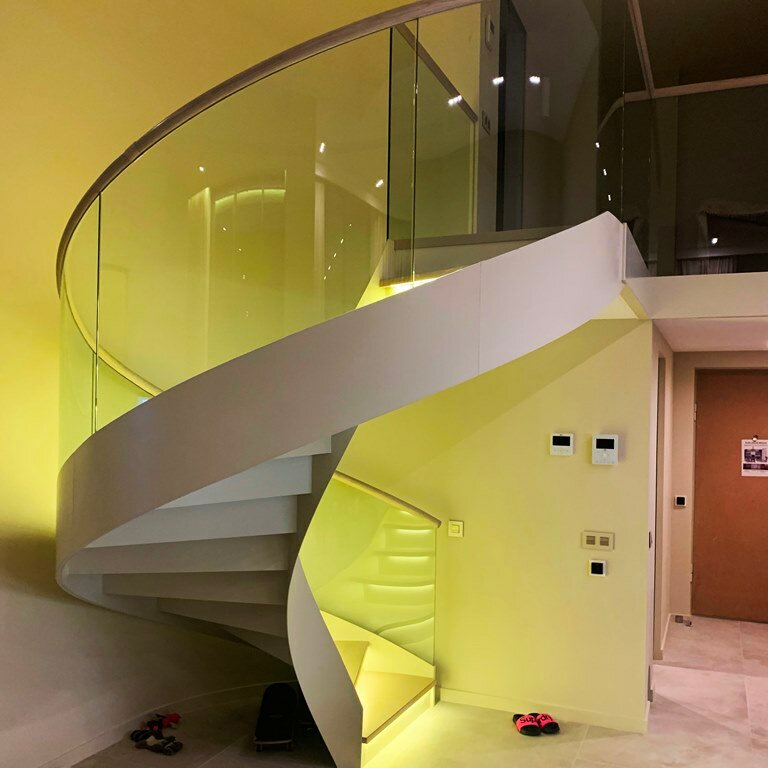В настоящее время винтовые лестницы с использованием гнутого/моллированного стекла, завоевывают всё большую популярность на современном рынке, что обусловлено в первую очередь их эргономичным дизайном и элегантным внешним видом. Останавливая свой выбор на винтовой лестнице и моллированным стеклянным ограждением, вы сможете максимально удачно спроектировать своё жилое пространство, придав при этом помещению привлекательный внешний вид.