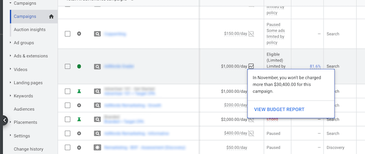 - На вкладке кампаний: выберите кампанию, диапазон дат которой включает текущий месяц. В столбце бюджета кампании наведите указатель мыши на бюджет или щелкните значок карандаша. Помимо возможности вносить изменения в свой средний дневной бюджет, вы также увидите ссылку на отчет о бюджете.