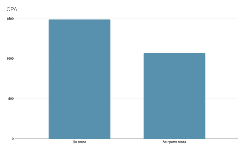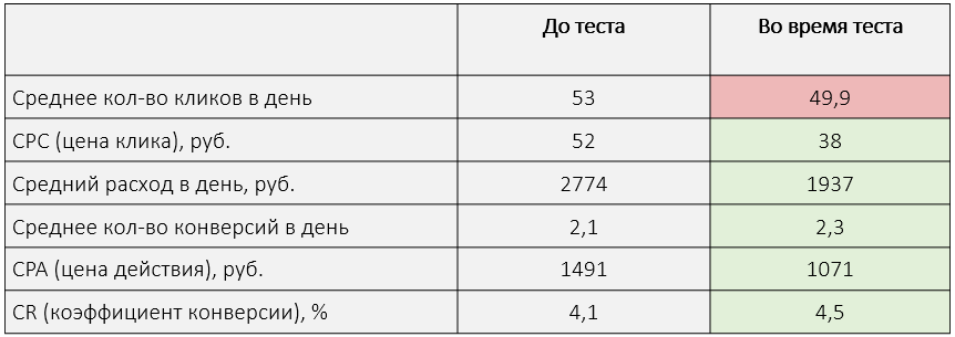 Количество кликов снизилось на 5 %, CPC снизилась на 26 %, расход сократился на 30 %, количество конверсий выросло с 2,1 до 2,3, CR увеличился с 4,1 до 4,5 %. CPA снизилась с 1491 до 1071 руб.