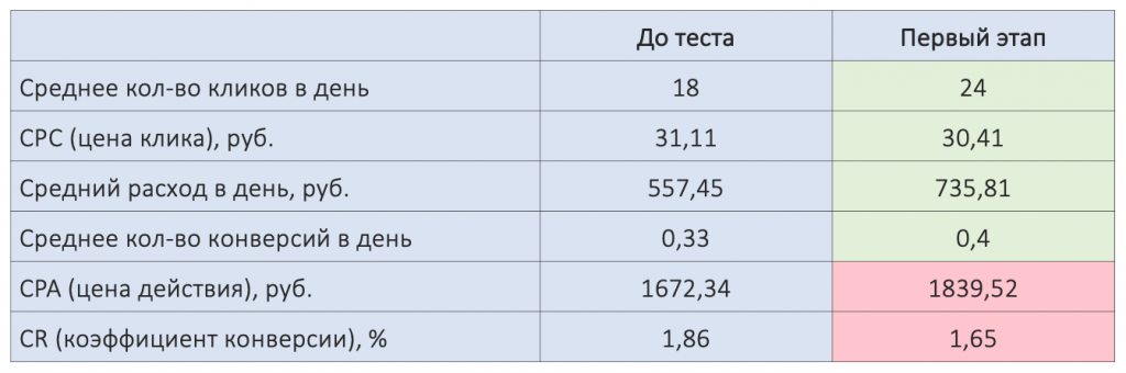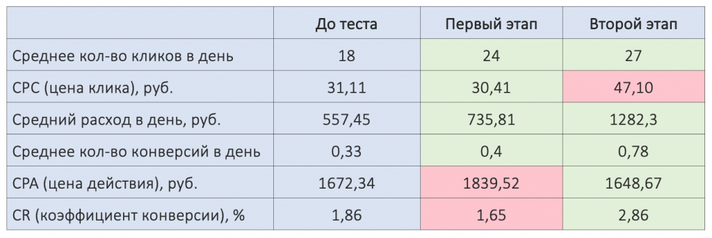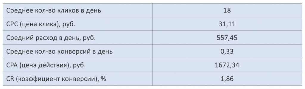 Ограничение дневного бюджета — 800 руб. От этой суммы расходовалось около 70 %, что давало возможность увеличить количество кликов за счет неиспользуемых остатков бюджета.