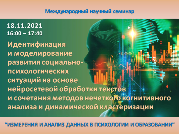 18 ноября с 16:00 до 17:40 состоится вебинар на тему «Идентификация и моделирование развития социально-психологических ситуаций на основе нейросетевой обработки текстов и сочетания методов нечеткого когнитивного анализа и динамической кластеризации».