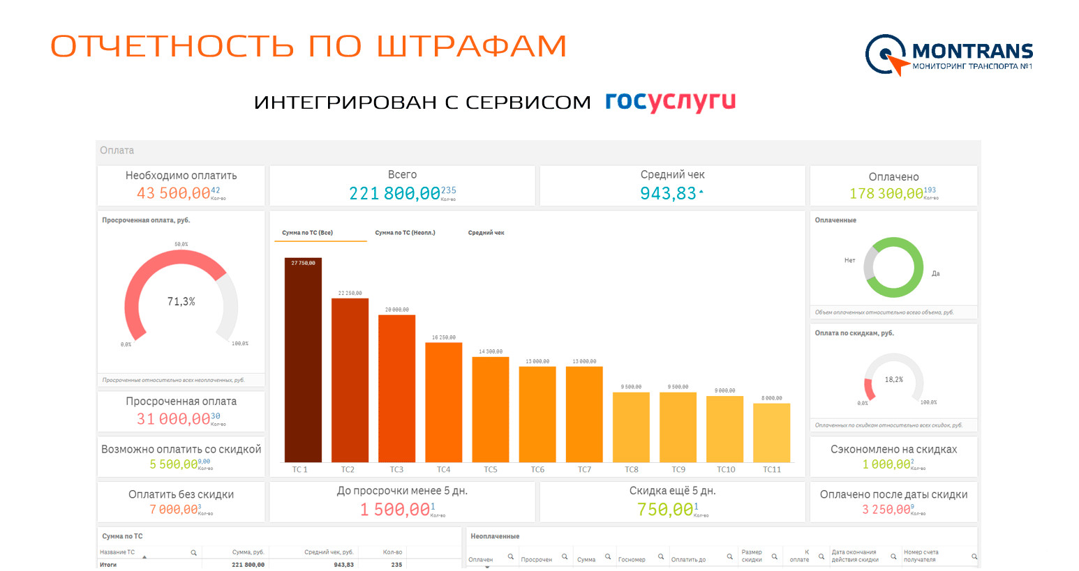 Данное решение упрощает задачи финансового и технического администрирования, объединяя все данные в рамках единого стандарта управления. В результате это позволяет контролировать затраты и помогает решать проблемы, связанные с издержками и эффективностью компании. Все данные по телеметрии, автопарку, водителям, путевым листам, топливу и ТО и ТР интегрируются в одну учетную систему, что позволяет получить полную информацию по транспортным средствам, исключив возможные ошибки и человеческий фактор. Содержание транспортной техники — само по себе большие затраты. Особенно это бьет по карману коммерческие предприятия, потому что к стоимости запчастей и ремонтных работ прибавляются финансовые потери из-за простоев. Чтобы все это предотвратить, нужно ВСЕ ВРЕМЯ постоянно и комплексно контролировать состояние всего транспорта, начисто исключив из этой цепочки человеческий фактор, предоставив возможность анализа хладнокровной и беспристрастной «машине». Уменьшение прибыли из-за топливных махинаций сотрудников и затратное ТО транспорта — далеко не последние «черные дыры» в системе управления автопарком. Компания может терять прибыль и благодаря некачественному уровню работы своих подчиненных, требующих выплачивать зарплату вовремя, а работающих при этом спустя рукава. Если у водителей сдельная оплата труда, велика вероятность что они будут дорисовывать себе дополнительные рейсы, наматывать километраж и время-часы. Это и нецелевое использование транспорта в рабочее время, сорванные сроки доставки и многое другое (уклонение от маршрута, порча товара, нарушение ПДД). При отсутствии понимания, чем занят сотрудник, компания теряет в деньгах, и в предоставлении качественных услуг своим клиентам (а клиенты не получают качественные услуги). Всё это можно взять под контроль и оптимизировать расходы."MONTRANS.ANALYTICS" позволяет объединять все процессы предприятия воедино.