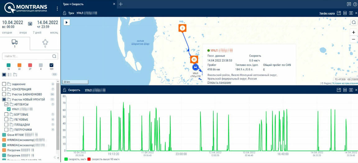 С компанией «Монтранс» мы плодотворно сотрудничаем с 2015 года. На сегодняшний день наш автопарк крановой техники, самосвалов, бульдозеров, экскаваторов, спецтехники и бортовой техники, оснащен в общем количестве более ста единиц.На данный момент большинство техники базируется на участке Бованенковского нефтегазоконденсатного месторождения. Весь автопарк оснащён системами спутникового мониторинга, контроля расхода топлива, контроллерами учёта топлива MONTRANS и тахографами.