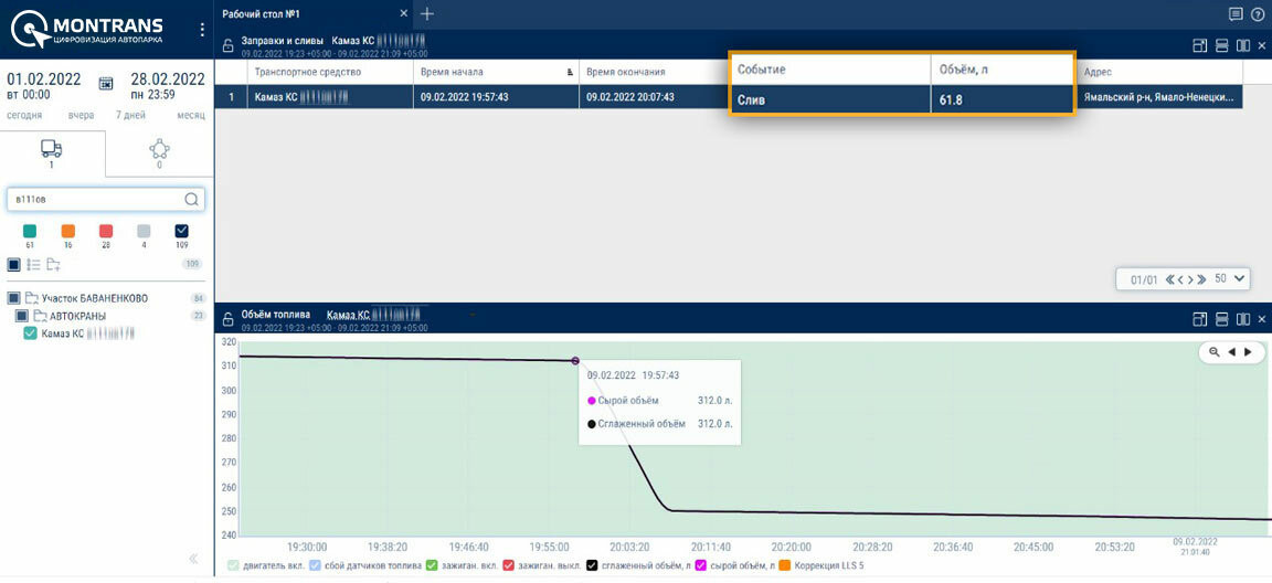 Система мониторинга и контроля на 100% ликвидирует несанкционированные сливы ГСМ в автопарке и помогает минимизировать издержки. Она подразумевает установку датчика уровня топлива (ДУТ) и подключение его к GPSГЛОНАСС терминалу. Программное обеспечение преобразует цифровые данные с терминалов в понятные визуальные графики и таблицы, что делает их анализ удобным и интуитивно-простым. Обмануть систему расхода топлива не представляется возможным, так как все доступные для вмешательства соединения пломбируются, и попытки взлома с целью воровства топлива или изменения данных скрыть не удастся. Програма мониторинга «Монтранс» — именно то, что дает возможность превратить набор приборов в полноценную систему мониторинга транспорта. Она является «лицом» этой системы, обрабатывает сведения, поступающие со спутниковых терминалов GPSГЛОНАСС, датчиков контроля расхода топлива, установленных на базе автомобилей с целью выбора оптимального, показатели расхода ГСМ и многое другое. Сотрудник транспортного предприятия, работающий с ПО, получает всю необходимую информацию через интуитивно-приятный веб-интерфейс в виде таблично-графических отчетов. Для установки и настройки программных решений компании «Монтранс» оперативно выезжают мобильные бригады наших специалистов, оказывающих сервис полного цикла. Обслуживание и техническая поддержка проводится по всей территории России.
