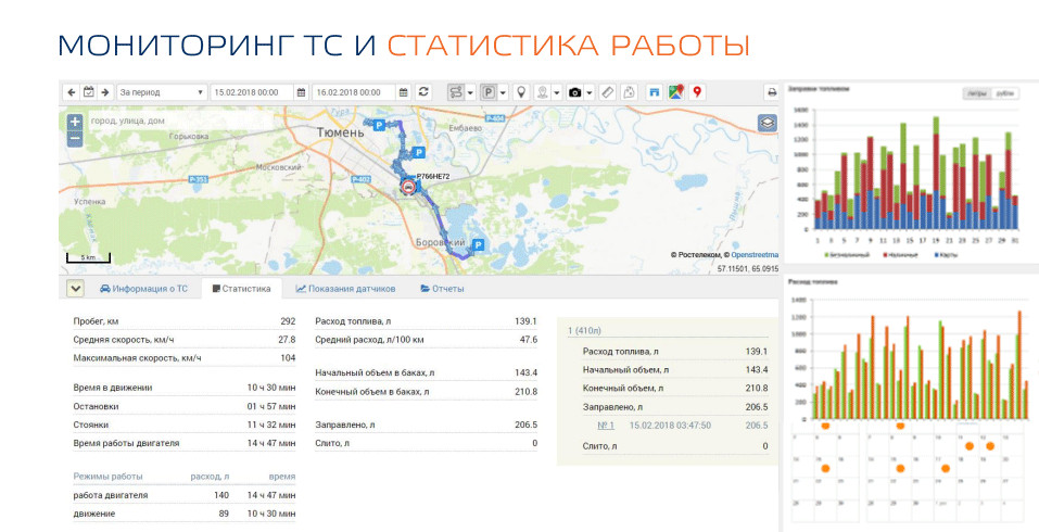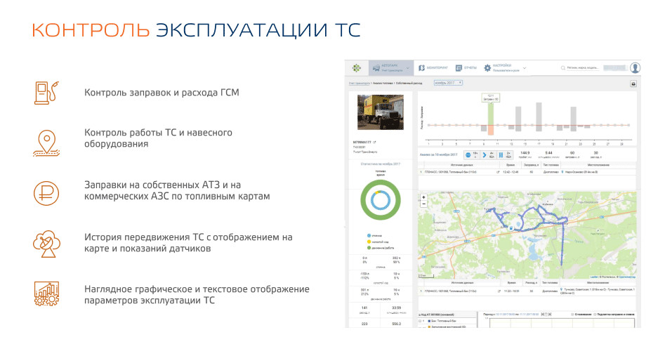 — Отслеживать текущее местоположение транспорта, скорость движения и расход топлива в режиме реального времени. — Оформлять заявки на техническое обслуживание и ремонт, отслеживать пробег, создавать календари ТОиР, статистику выполненного ремонта, выводить финансовую отчетность по работам, закупленным, установленным и отремонтированным запчастям. — Вести персональную транспортную карточку каждой единицы техники с ее ТХ, фотографией, перечнем установленных приборов, датчиками и контроллерами ГЛОНАСС, активными страховыми листами и пройденными техосмотрами. — Корректировать стиль вождения (превышение скорости, перепады резких стартов и торможения), создавать рейтинг водителей, поминутный список нарушений ПДД (даже если оно не зафиксировано) с последующими страховыми выплатами, соблюдение режима труда и отдыха водителей согласно показателям тахографа.
