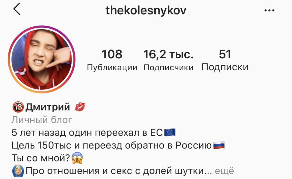 Эстонский микроинфлюенсер Рээн Бьёрг.Сейчас более известен как Дмитрий Колесников решается вернуться в Россию, когда наберет 150тыс последователей.