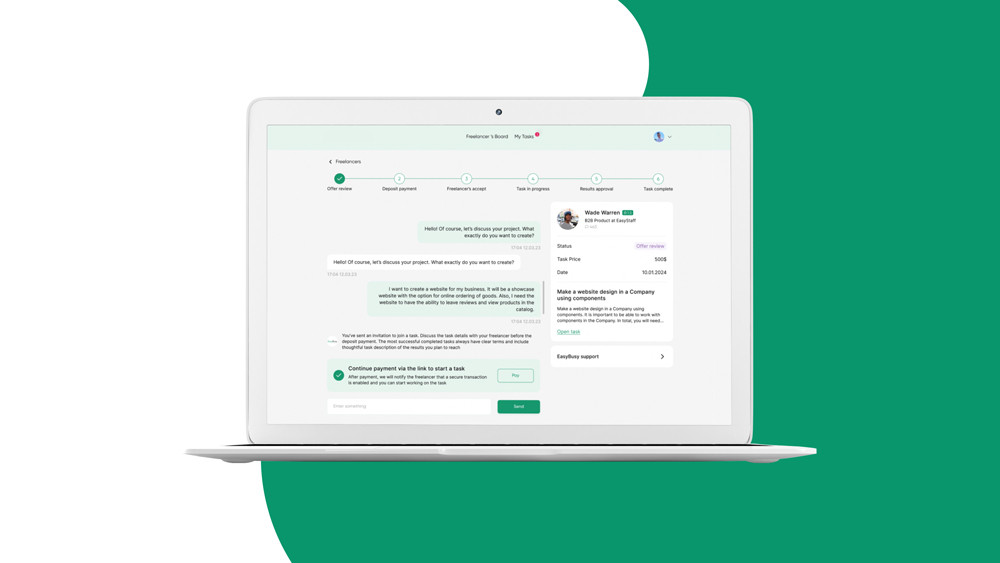 Особенностью сервиса является возможность оплаты работы фрилансера сразу внутри карточки задачи. Для этого настроена интеграция с системой для защищённых интернет-платежей Stripe, а также доступна оплата по реквизитам. Благодаря бесшовной интеграции с сервисом EasyStart фрилансеры смогут получать оплаты в долларах и евро, а выводить деньги практически на любую банковскую карту.