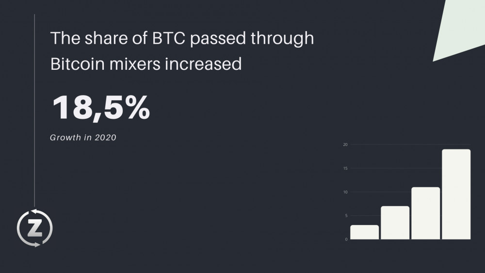 В 2020 году доля BTC, прошедших через биткоин - миксеры возросла на 18,5%