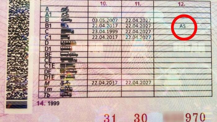 Наличие пометки AS в документе указывает на то, что водитель имеет ограничения в разрешении на вождение транспортом подкатегории B1 (в правах указывается конкретный тип транспорта, которым сможет управлять водитель).