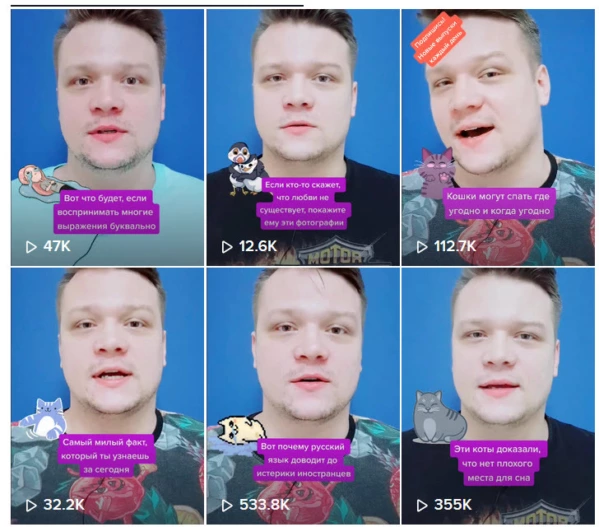 - Придумал рубрики. Если я замечаю, что тема «стреляет», то делаю еще одну часть. И так до тех пор, пока не увижу падения просмотров. Потом ищу новую «трафиковую» тему. Так, например, родилось 3 части «скороговорок из трех слов». Или серия видосов «как животные видят мир».