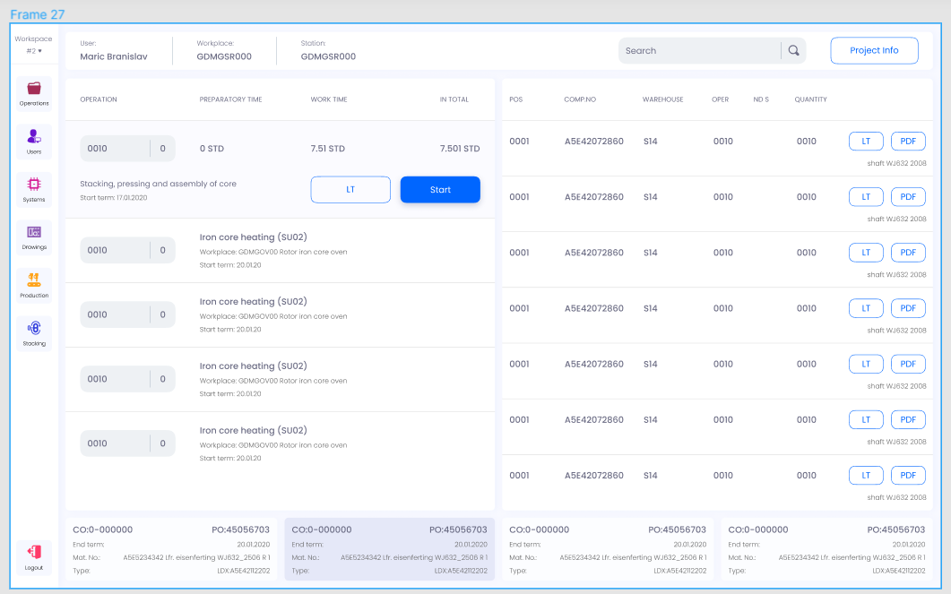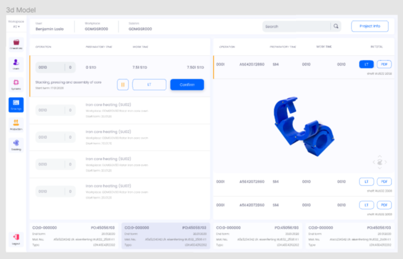 Основной экран приложения — это таблица со всеми задачами и подзадачами, доступными пользователю (сотруднику завода). Выбрав один из процессов в правой части таблицы, пользователь видит в нижнем блоке связанные подзадачи, а в левой части — всю документацию. Пользователь может изменить статус процесса, например, запустить его в производство, или просто получить по нему необходимую информацию. Через функцию поиска сотрудник может найти задачу, изучить подробности и связанную документацию. Также в отдельном окне работник может сообщить о результатах выполнения задания, например, указать количество изготовленных изделий. Пользователь может скачать в формате PDF все чертежи и спецификации, к которым у него есть доступ. Нажав кнопку LT, можно посмотреть информацию о нужной детали прямо в приложении. В правой части экрана откроется 3D-модель детали и технические спецификации. Теперь документооборот на заводе Сименс в Сербии ведется в электронном виде. На рабочих местах сотрудников производства, работающих с документацией, установлены планшеты с доступом к информационным базам. Сотрудники могут просматривать нужные документы и вносить изменения, которые затем видят коллеги. Это позволяет экономить время на обмен информацией по проекту и также ускоряет производственные процессы. За несколько месяцев работы с планшетами, компания зафиксировала рост производительности 20%. IT-директор заказчика оценил Satisfaction rate на 90%.