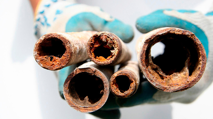 - Соли железа. Железо присутствует в воде в виде растворимых соединений и нерастворимых взвесей. Примеси солей металла вызывают интенсивную коррозию медных, латунных и алюминиевых комплектующих, забивают регулирующую арматуру, накапливаются на нагревательных элементах, стенках труб и тепловых агрегатов.