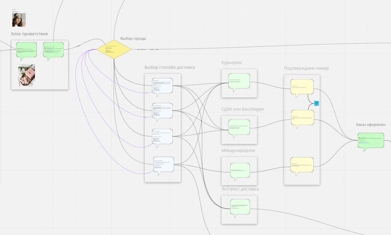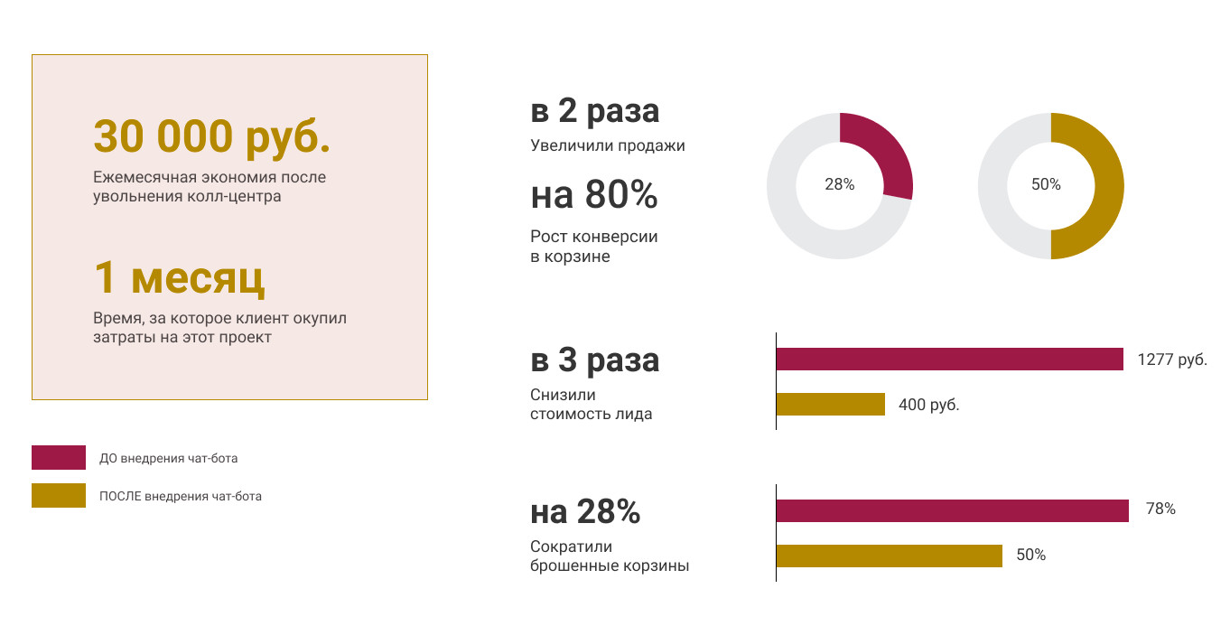Задача этой статьи — донести ценность продукта при относительно высокой его стоимости. Так как продукт покупали в основном для подарков, идея была сделать выбор быстрее и проще, чем в интернет-магазине. А заодно и увеличить средний чек — конструктор индивидуального набора спроектирован таким образом, что проходя его человек выбирает больше, чем в интеренет- магазине. Но гипотезы не подтвердились, результаты нас не устроили. Люди дальше статьи не шли и в квиз не проваливались. А при трафике сразу на квиз мы получали лидов, но конверсия в оплату была минимальна. Работа проделана, автоворонка создана и запущена, а ожидаемого результата нет. В этой нише лид-магниты не работают — мы поняли это очень быстро. Очевидно, что холодный трафик надо вести в аккаунт Instagram и на сайт, которые неплохо справляются с информационной подачей и прогревом покупателей. Но если много людей интересуются продуктом и идут в Instagram, потом на сайт, то почему же так мало покупают? Так мы стали смотреть в направлении конверсий. Все продажи идут через сайтАнализируем путь покупателя от аккаунта в Instagram до момента оформления заказа на сайте. Промо страница удобно и стильно оформлена: товар качественно и эстетично показан крупным планом, сразу видна кнопка «заказать» и вся необходимая информация о товаре и его преимуществах. Потенциальный покупатель изучает ассортимент, кладет понравившийся товар в корзину, а дальше ему необходимо оформить заказ. И на этом этапе происходит сбой. Итого завершают оформление всего 28% людей из тех, кто перешел в корзину. PS: у заказчика в Яндекс.Метрике под целью «oplata» считается посещение страницы «Thank you page», а не фактическая оплата клиента. Почему оформляют заказ лишь 28 человек из 100, положивших товар в корзину, а оплачивают и того меньше? Есть такое понятие — «брошенные корзины». Мы предположили, что проблема в заполнении огромной формы заказа и дальнейшем пути клиента к оплате и получению своей покупки. Гипотеза: если сократить кол-во полей в корзине — конверсия вырастет. Убираем поля с вводом адреса и выбором службы доставки, тестируем и замеряем конверсии. Результаты нашего теста, который длился неделю: Итого завершили оформление уже 50% людей, из тех, кто перешел в корзину. Мы убрали в форме 2 поля, а конверсия сразу +80% (с 28% до 50%).То есть показатель «брошенные корзины» снизился с 72% до 50%. Также в процессе аудита стали очевидны узкие места и то, что можно оптимизировать: работа менеджеров, множество отдельных сервисов для общения и обработки заказа и др. И приступаем к реализации. Докручиваем то, что уже есть на сайте, но работает неэффективно: UX-форму и обработку заказа. Когда потенциальный покупатель добавляет товар в корзину и переходит к оформлению заказа, он сталкивается с огромной формой, которую надо заполнить. Чтобы уменьшить кол-во брошенных корзин, мы сократили форму на 2 поля и по результатам тестов увидели резкий скачок конверсии. От уже спроектированной автоворонки в WhatsApp мы отсекаем первую часть (лид-магнит и квиз) и подключаем чат-бота на весь этап оформления заказа и согласования доставки. Так мы автоматизируем процесс, сделаем его рабочим 24/7, исключим участие менеджера и человеческий фактор, который зачастую мешает продажам. И больше не будем нуждаться в услугах колл-центра! Раньше после оформления заказа покупателю п