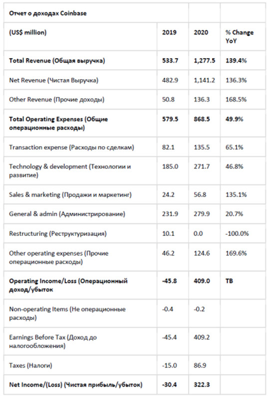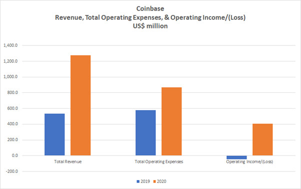 Операционная прибыль (прибыль от основной деятельности — комиссии за куплю/продажу криптовалют, обслуживание) компании составила $409 млн в 2020 году по сравнению с операционным убытком в размере $45,8 млн в 2019 году.