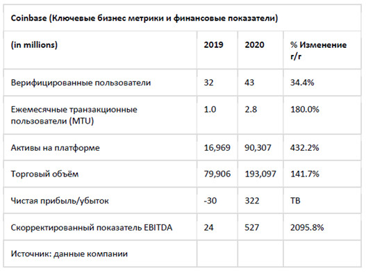 млрд на конец 2020 года, увеличившись на 43%. Объём торгов на Coinbase вырос с