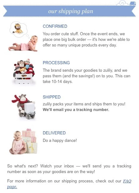 «Ваш заказ принят к исполнению. Мы оцениваем время доставки посылки при наличии заказанных товаров как приблизительно 5-8 дней. Мы отправим вам следующее письмо после отправки заказа», — просто, но эффективно.