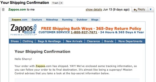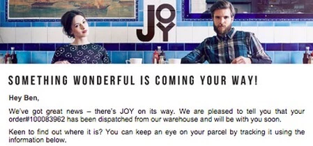 При составлении email требуется проявить творческий подход и не довольствоваться только идентификационным номером посылки и сообщением «Ваш заказ был отправлен»: клиенты хотят получить больше конкретных сведений, изложенных в форме личного обращения.