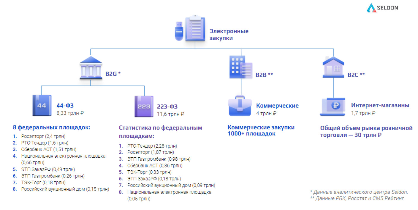 Seldon более 13 лет работает с открытыми данными о компаниях и торгах. Информацию о тендерах мы собираем из 7 тыс. источников — с федеральных и коммерческих электронных торговых площадок, сайтов организаций, информагентств, печатных изданий и различных интернет-ресурсов. Это позволяет нам формировать целостное представление о ситуации в B2G, анализировать показатели и строить прогнозы на их основе.