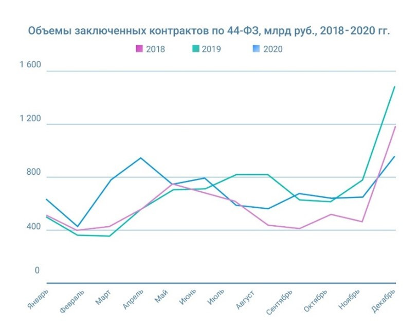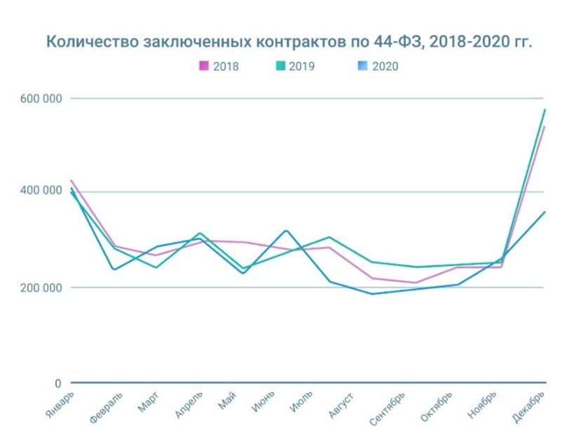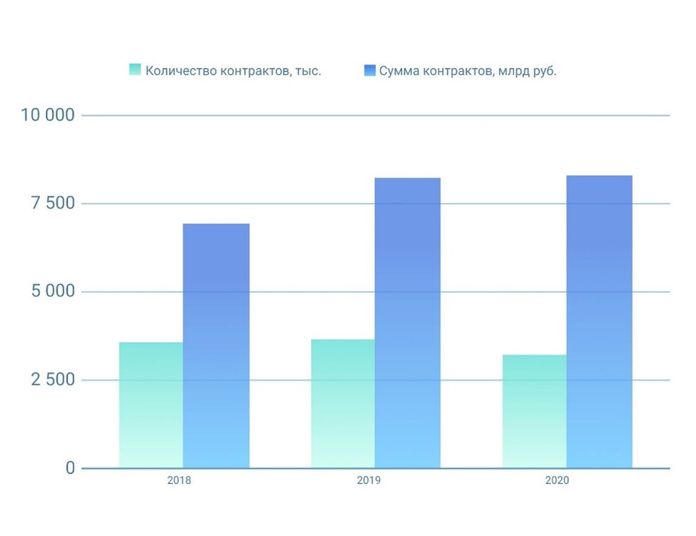 Так, оценка количества и сумм контрактов, заключенных по 44-ФЗ, показала, что на протяжении трех последних лет эти цифры были вполне сопоставимы. В 2020 году, благодаря реализации заранее запланированных закупок, количество контрактов отличалось от предыдущих показателей несущественно (3 216 тыс. против 3 645 тыс. годом ранее).