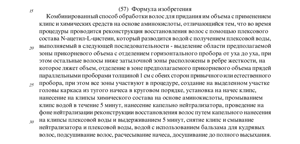 Пример заполнения заявочной документации на основании полученного нами патента на способ обработки волос. Формула изобретения — это краткая характеристика сущности разработки. Она пишется одним предложением, даже если оно огромное. Именно формула определяет объем правовой охраны. Она может быть однозвенной или многозвенной, зависит от количества самостоятельных пунктов. Формула описывается в статическом и динамическом состоянии. Она состоит из двух частей: ограничительная и отличительная. Схема формулы выглядит так: Название заявленного изобретения + ограничительная часть + отличающийся тем, что + отличительная часть. Реферат — это сокращенное описание разработки до 1000 символов. Схема реферата выглядит так: Название изобретения + характеристика области техники и применения + пример применения + технический результат + сущность изобретения. Для правильного составления всех форм рекомендуем изучить уже зарегистрированные похожие изобретения и обратить внимание на описание и формулу. Полезная модель — это исключительно техническое решение, которое схоже с изобретением, но для ее регистрации не нужно, чтобы разработка имела изобретательский уровень. Список документов такой же, как и для подачи заявки на изобретение. Заявка заполняется в установленном формате. Укажите верно данные о разработчике и будущем правообладателе. Примеры заполнения заявки есть на сайте Роспатента. Описание полезной модели можно создать по схеме для изобретений. Пример заполнения заявочной документации на основании полученного нами патента на защитный комбинезон. Перед этим нужно провести патентный поиск. Формула полезной модели и реферат также идентичны схеме для изобретений. Промобразец — это решение внешнего вида, дизайна изделия. Для того чтобы пройти регистрацию нужно подать следующие документы: Заявление можно скачать на сайте Роспатента, там же есть пример его заполнения. Для того чтобы правильно составить описание промобразца нужно учитывать следующие правила: Описание промобразца составляется по следующей схеме: Название в единственном числе + назначение и область применения + описание аналогов и сравнение с разработкой + описание изображений + сущность заявленного объекта и его преимущества. Пример заполнения заявочной документации на основании полученного нами патента на крышку для банки. Комплект изображений должен быть полным. В него входят: Изображения должны быть хорошего качества. Допустимы фотографии и графические иллюстрации. Фон лучше использовать белый. Перечень существенных признаков состоит из эстетических и эргономических особенностей, указанных в описании. Объект описывается в статике. Перечень для одного промобразца состоит из одного пункта. Схема перечня для одного промышленного образца: Родовое понятие + характеризующееся, включающее, состоящее + совокупность существенных признаков: может иметь ограничительную и отличительную часть при сравнении с аналогом. Для каждого объекта обязательное условие — оплата госпошлины. Квитанцию прикладывают к документам и представляют в Роспатент. Основная трудность самостоятельного составления заявочной документации — предварительно нужно провести детальный патентный поиск по мировым базам. Как это сделать самостоятельно, расскажем в следующих стать