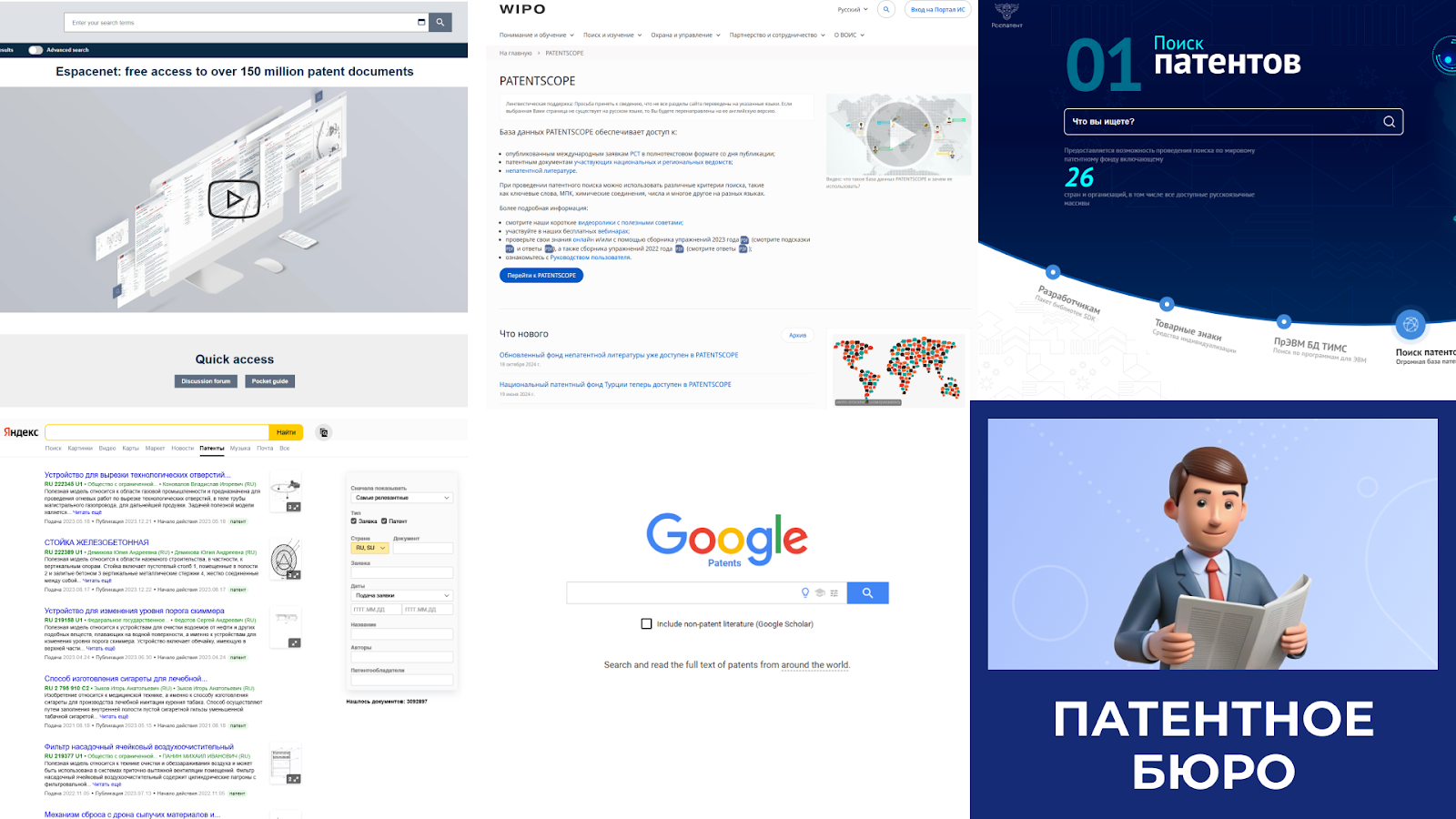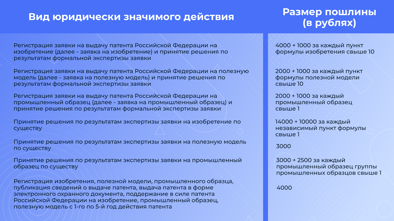 Использовать можно поисковые системы Роспатента, Espacenet, Яндекс.Патенты, Гугл.Патенты, PATENTSCOPE, а также любые другие общедоступные источники. Качественный поиск также могут провести патентные поверенные. Изобретение — это техническое решение, которое относится к продукту, способу или применению продукта. Примеры запатентованных нами изобретений: Полезная модель — это техническое решение, которое относится к устройству. Примеры запатентованных нами полезных моделей: Промышленный образец — решение внешнего вида изделия или кустарно-промышленного производства. Примеры запатентованных нами промышленных образцов: В 2024 году были внесены изменения, которые позволяют получать патенты на некоторые объекты из сферы IT-технологий, раньше это было невозможно. Теперь разработчики программного обеспечения, стартапы и IT-компании могут защитить свои инновации в рамках патента. Это действительно большой шаг вперед. Чтобы получить патент на любую из перечисленных разработок, нужно подать заявку в Роспатент лично, почтой или через электронные платформы: ФИПС, Госуслуги. Не все разработки могут быть запатентованы в качестве изобретений. В ст. 1349-1350 ГК РФ указаны те объекты, в выдаче патентов на которые эксперты откажут. Дополнительные требования к объекту — новизна, изобретательский уровень, промышленная применимость. В заявочную документацию для изобретения стандартно входят: Заявка оформляется строго в соответствии с требованиями закона и правилами Роспатента. Формы документов и примеры заполнения можно найти на сайте ФИПС. Готовую заявку направляют в Роспатент, где эксперты проверяют документы, а потом и объект на возможность патентования. В заявке на полезную модель должно быть только одно техническое решение, недопустимо указывать несколько независимых пунктов формулы или совокупностей существенных признаков. К ПМ предъявляют только 2 основных требования: новизна и промышленная применимость. Для патентования полезной модели нужно собрать: Заявление заинтересованного лица. Формы документов можно посмотреть на сайте ФИПС. В заявке на промышленный образец основными элементами являются изображения патентуемого объекта. Чаще всего запросы и уведомления от экспертов приходят из-за направления некачественных визуальных материалов. Обратите внимание на эти нюансы: Для патентования промышленного образца в Роспатент направляют: У Роспатента есть четкие требования к формам заявок в зависимости от того, что именно вы хотите запатентовать. Вам нужно подготовить все документы по правилам, чтобы ваша заявка не была отклонена из-за каких-то мелочей. Подробнее о заполнении заявок в нашей статье: В процессе патентования любого вида разработки у экспертов могут возникать сомнения. Заявители в этом случае получают уведомления. На них обязательно надо ответить. Это не значит, что в патенте точно откажут. Эксперты могут просто попросить уточнений. Для получения патента необходимо оплатить государственные пошлины. Их величина изменилась в 2024 году. Актуальный размер пошлин указан на изображении. В некоторых случаях получить патент можно бесплатно или со скидкой до 90%. Это значит, что даже если у вас ограниченный бюджет, вы все равно можете защитить свои разработки и идеи. Получить патент бесплатно смогут авторы: Заплатить меньше ста