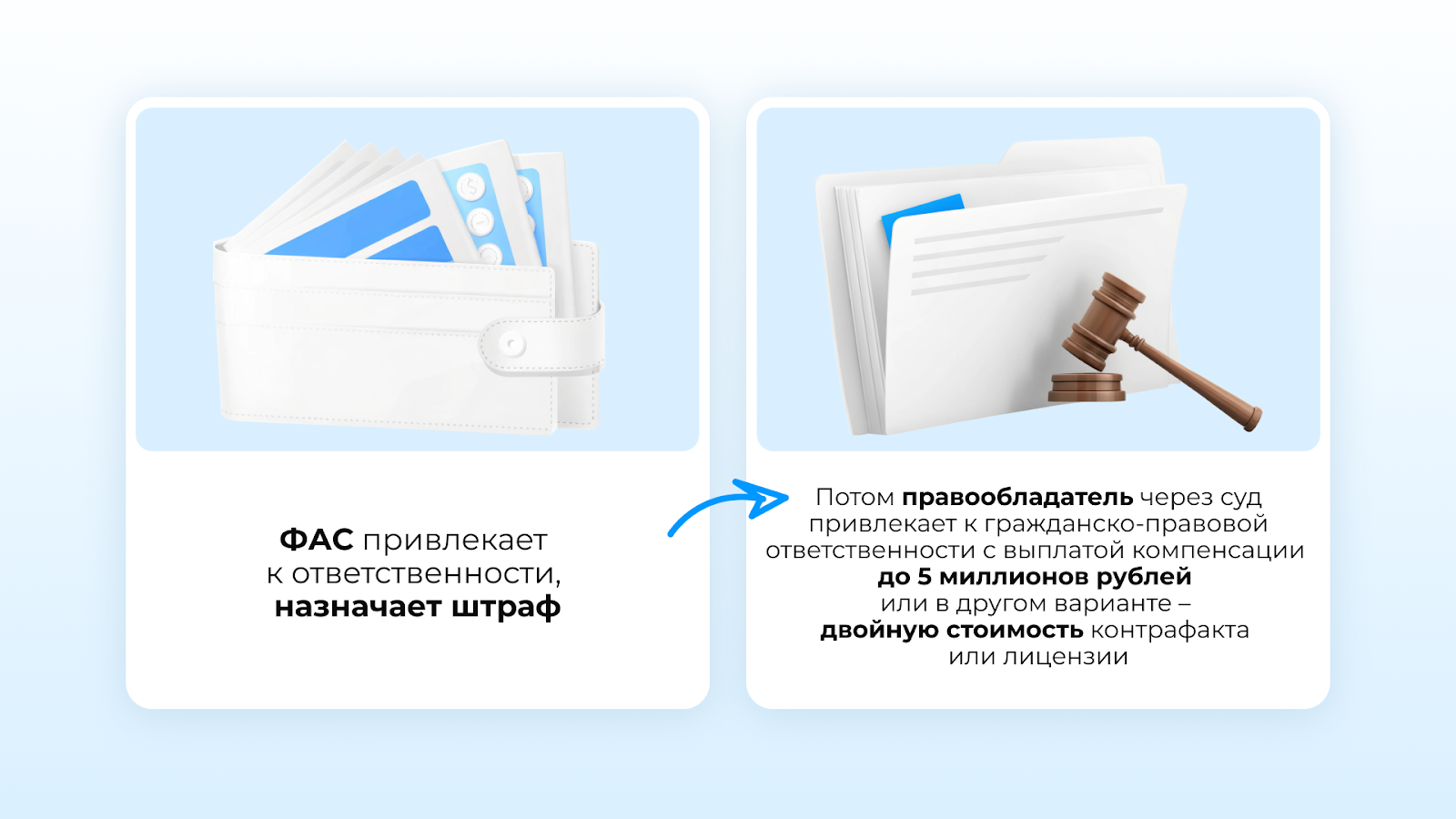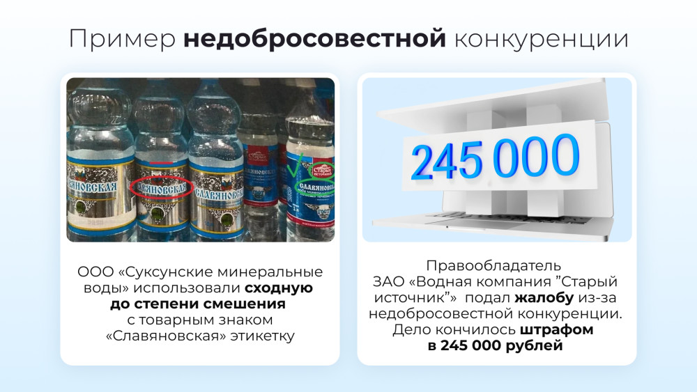 ООО «Суксунские минеральные воды» использовали сходную до степени смешения с товарным знаком «Славяновская» этикетку, в результате чего правообладатель ЗАО «Водная компания „Старый источник“» подал жалобу из-за недобросовестной конкуренции. Дело кончилось штрафом в 245 000 рублей. УФАС признала, что использование этикетки явно вводит потребителей в заблуждение и причиняет убытки правообладателю. Запрет на недобросовестную конкуренцию, связанную с использованием результатов интеллектуальной деятельности и средств индивидуализации, предусмотрен статьями 14.4, 14.5 и 14.6 Федерального закона номер 135-ФЗ «О защите конкуренции». В статье 14.4 Федерального закона № 135-ФЗ «О защите конкуренции» установлен запрет на недобросовестную конкуренцию, которая выражена в приобретении и использовании исключительных прав на товарный знак и другие средства индивидуализации: НМПТ, фирменное и коммерческое наименование. Для квалификации нарушения по ст. 14.4 необходимо одновременное наличие двух условий: Примеры противоправных действий: Когда незаконно зарегистрирован товарный знак конкурентом, механизм работы этой нормы проявляется в том, что: В случае с фирменными наименованиями и коммерческими обозначениями второй шаг делать не нужно. Достаточно предписания антимонопольного органа о прекращении эксплуатации спорного наименования, чтобы принудить нарушителя прекратить использование не принадлежащих ему средств индивидуализации. В статье 14.5 Федерального закона № 135-ФЗ обозначен запрет на использование чужой интеллектуальной собственности. Под защиту попадают объекты, перечисленные в ст. 1225 ГК РФ. Использовать чужие объекты авторского права почти всегда небезопасно, смотрите видео об одной из распространенных ситуаций: Взять чужую статью и опубликовать ее сокращенный вариант: это законно? Предположим, «Компания 1» производит продукцию, запатентованным способом. Если «Компания 2» выходит на рынок с товаром, произведенным по запатентованной технологии, это приводит к нарушению прав владельца патента, т.е. к недобросовестной конкуренции. Запатентовать свою разработку не так сложно, но нужно обратить внимание на детали, смотрите видео: Как составить описание изобретения, чтобы получить патент? Статья не распространяется на средства индивидуализации (товарные знаки, фирменные наименования). Такие случаи регулируются ст. 14.4 или 14.6 Закона. Не считается нарушением использование РИД после прекращения патентной защиты. Например, если патент аннулирован досрочно, объект переходит в общественное достояние до истечения первоначального срока. Чаще всего по этой статье привлекают к ответственности за: В результате незаконных действий нарушитель снижает издержки за счет отсутствия лицензионных выплат, захватывает рыночную долю за счет ускоренного вывода товара, получает прибыль, которая законно могла бы принадлежать правообладателю. Антимонопольные органы акцентируют внимание на доказывании связи между использованием РИД и ущербом. Например, необходимо подтвердить, что незаконное применение объекта повлияло на рыночные позиции правообладателя. В статье 14.6 ФЗ обозначен запрет на использование чужих средств индивидуализации и смешение через дизайн и стиль. Например, если «Компания 1» и «Компания 2» работают в одной сфере деятел