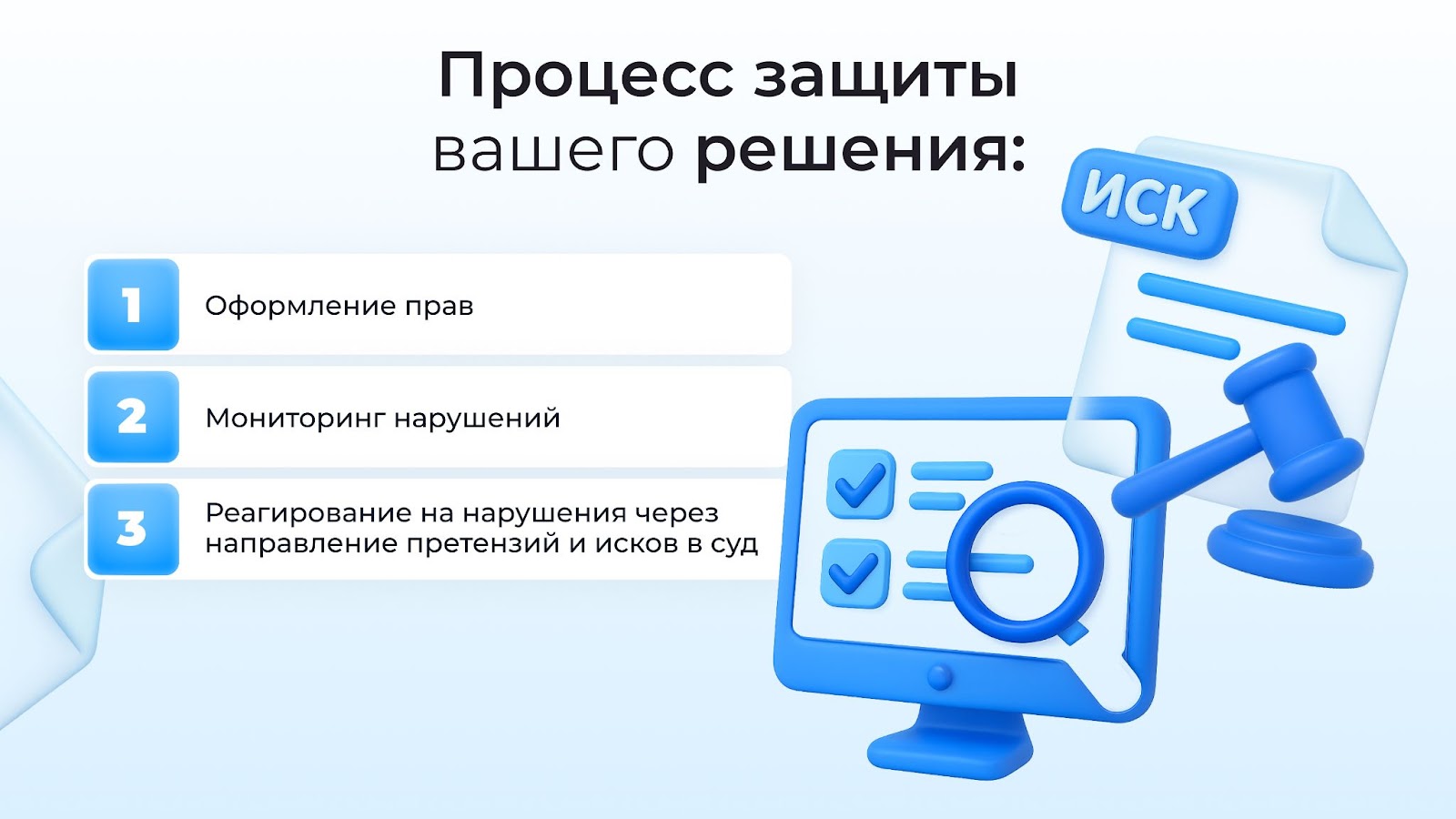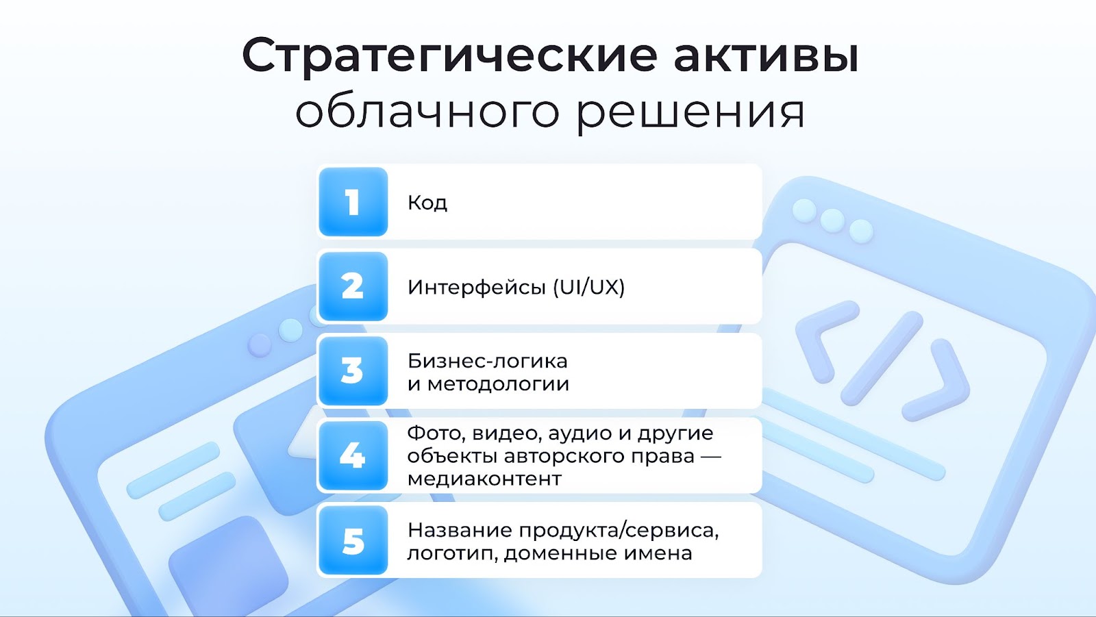 Каждый из перечисленных элементов — стратегический актив вашего облачного решения. Ваши действия прямо сейчас: Для каждого выявленного на первом шаге ценного объекта ИС нужно сразу определить оптимальный инструмент защиты: авторское право, патент, товарный знак, коммерческая тайна, договоры. Начнем с кода, который является объектом авторского права. Оно возникает автоматически у автора при создании, однако заявить «Я — автор» или «Код создан по нашему заказу» — недостаточно. Фиксируйте авторство и даты создания доступными способами — например, в Роспатенте. Полученное в результате процедуры свидетельство усиливает позицию в суде. Еще один вариант защиты — коммерческая тайна. Подходит для уникальных алгоритмов и «секретных фишек», особенно в Backend. Оформляется внутри организации через пакет документов и заключение соглашений о неразглашении. И, конечно, не забывайте заключать договоры с разработчиками: К слову, свидетельство о регистрации кода в Роспатенте пригодится вам, если решите попасть в реестр отечественного ПО Минцифры. Программное обеспечение можно внести в реестр Минцифры. Зачем? Ответ в этом видеоролике: Какие преимущества даёт внесение ПО (программное обеспечение) в реестр Минцифры? Основной инструмент защиты для визуальных элементов (UI — графический дизайн, иконки, анимация) и «литературного» выражения UX (тексты, описания сценариев) — это авторское право. Как я уже говорил, оно возникает сразу же после создания объекта, но доказать авторство сложно. Для этого нужно, как минимум, фиксировать этапы разработки (мокапы, финальные скриншоты, версии в Figma). Защиту также может обеспечить патент на промышленный образец, но он подходит только для уникального внешнего вида, я бы даже сказал, очень отличающегося визуального стиля интерфейса. Патент на изобретение или полезную модель возможен для защиты инновационных и нетривиальных UX-решений, например, уникальный способ организации данных в интерфейсе для ускорения работы. Получить патент сложно, экспертиза требует от решения новизны, изобретательского уровня и даже промышленной применимости. При создании интерфейсов нельзя забывать о договорах. Аналогично коду — это трудовые и подрядные с четким переходом прав и NDA. Применять коммерческую тайну к интерфейсам достаточно трудно, так как они, как правило, на виду. Сохранить в тайне можно только внутренние исследования пользователей, прототипы, неопубликованные UX-методики. Используют NDA. Оформление прав — это не последний шаг в защите вашего решения. Потом вам нужно регулярно отслеживать конкурентов на предмет копирования интерфейса, а при обнаружении направлять претензии и иски в суд. Оптимальным и малозатратным способом защиты для таких объектов будет коммерческая тайна. Суть уникальной методологии должна оставаться секретом. Вам нужно создать максимально строгое соглашение о конфиденциальности (NDA) особенно с сотрудниками, имеющими доступ к ядру логики, и партнерами, жестко разграничить доступ и обозначить санкции за разглашение. Как я уже отмечал, часто бизнес-логика и методологии уходят вместе с сотрудниками. Ваша задача — этого не допустить. Обратите внимание на возможность получения патента на изобретение. Это хороший вариант, если методология — техническое решение, которое соответствует критер