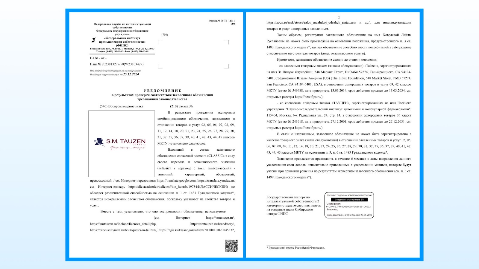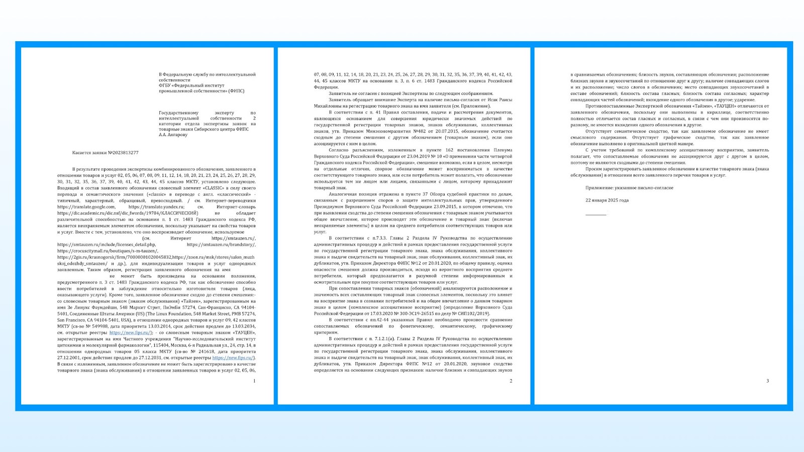 Регистрация на кириллице защищает знак в его оригинальном написании. Транслитерация и транскрипция считаются разными словесными обозначениями. Чтобы защитить бренд от копирования в латинском написании, нужно регистрировать эти варианты отдельно. Это особенно важно сейчас, поскольку принят новый закон, который запрещает использование иностранных слов в рекламе и на вывесках, за исключением товарных знаков. Дальше нужно определиться, для каких товаров/услуг вы используете или планируете использовать обозначение. Ориентироваться при выборе видов деятельности надо по Международной классификации (МКТУ) в актуальной редакции. На этом этапе вы можете совершить первую ошибку — выбрать слишком мало классов МКТУ и не защитить обозначение в основных видах деятельности или указать слишком много классов и потратить больше, а потом потерять ТЗ из-за неиспользования. Поэтому тщательно проанализируйте текущие и планируемые виды деятельности на ближайшие 5-10 лет. Ответьте: Например, производитель одежды может добавить классы для парфюмерии, сумок. Теперь проанализируйте описания классов МКТУ. При сомнениях проконсультируйтесь с патентным поверенным. Помните, что если вы зарегистрируете ТЗ в каком-то классе, но потом не будете его использовать 3 года после регистрации, любое заинтересованное лицо может подать заявление и досрочно прекратить охрану обозначения в отношении всех или части товаров/услуг этого класса по причине неиспользования. Если вы не сможете доказать использование знака в этом классе за последние 3 года, охрана прекратится. Поэтому регистрируйте только в тех классах, где реально будете использовать или серьезно планируете. Важно убедиться, что обозначение уникально и не нарушает права других. В реестр могут попасть только товарные знаки, которые не сходны по звучанию, смыслу или визуалу с уже зарегистрированными в конкретном классе. Есть специально разработанный сервис, где каждый может проверить ТЗ самостоятельно. Ищите тождественные и сходные до степени смешения знаки по вашим классам МКТУ. Сложность проверки в анализе результатов. Сравнить обозначения и дать на 99% точный ответ о наличии или отсутствии сходства может только опытный специалист по регистрации ТЗ, поскольку он знает критерии сходства и практику. Почти во всех патентных бюро предварительная проверка бесплатна. Нас часто спрашивают, достаточно ли просто проверить точное совпадение названия. Ответ — конечно, нет. В процессе поиска нужно учитывать фонетическое (звуковое сходство), семантическое (смысловое сходство, даже на разных языках) и визуальное (для логотипов). Нужно искать не только тождественные, но и сходные до степени смешения знаки в ваших классах МКТУ и даже в смежных классах. Есть классы, которые включают похожие товары и услуги. Дополнительно можно использовать для проверки поисковики, соцсети, реестр юрлиц. Вам нужно понять, есть ли конкуренты с похожими названиями в вашей сфере. Ошибка — пропускать этот этап или проводить проверку поверхностно. Вы рискуете получить отказ от эксперта, который выявит сходство. Рекомендую обратить внимание на основания для отказа, указанные в ст. 1483 ГК РФ. Главное! Товарный знак должен: ТЗ не должен: Возможно, вам придется получить дополнительные согласия или заранее подготовиться к ответам на 