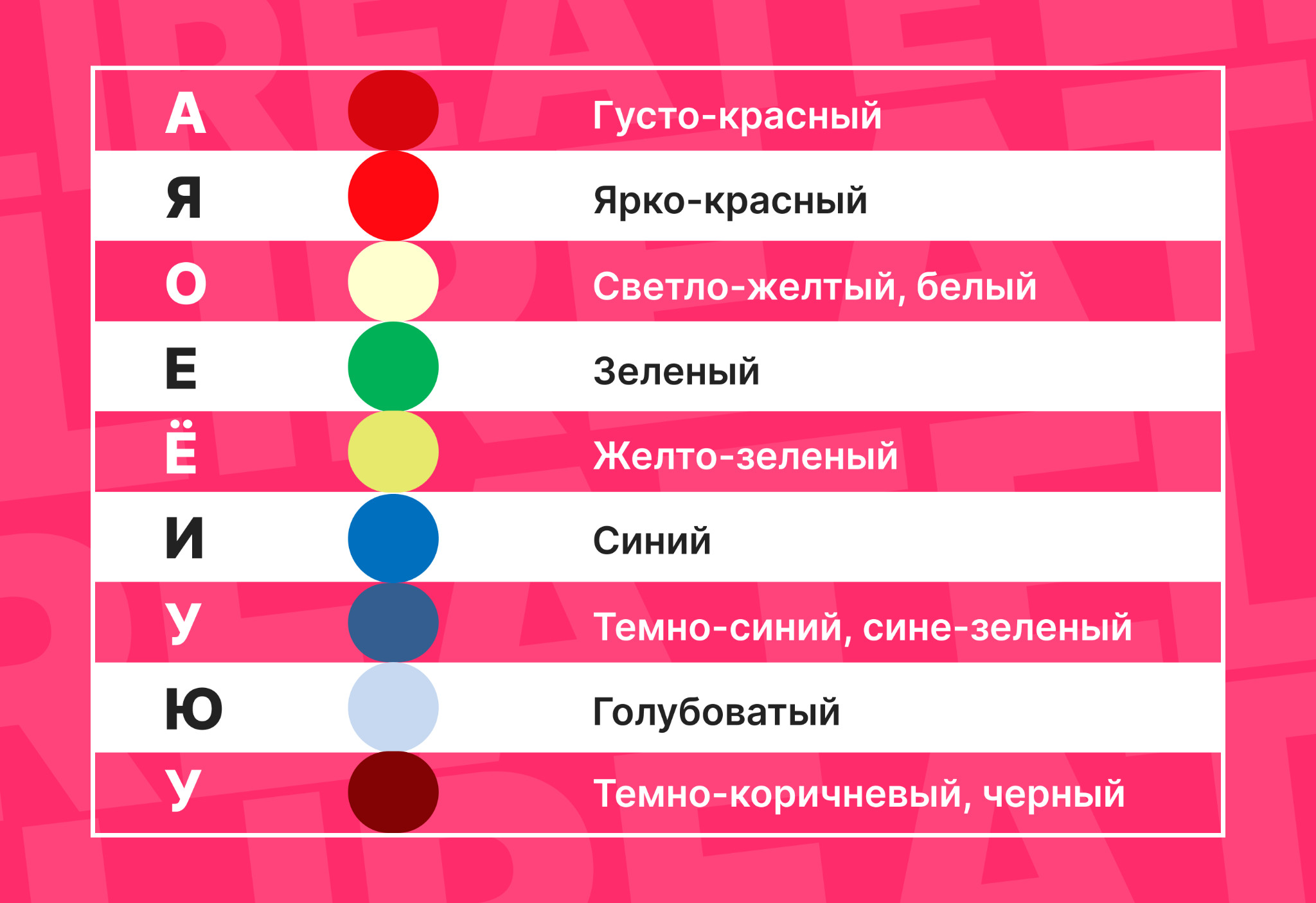ярко-красный, [о] — светло-желтый, белый, [е] — зеленый и т.д. Этот факт
