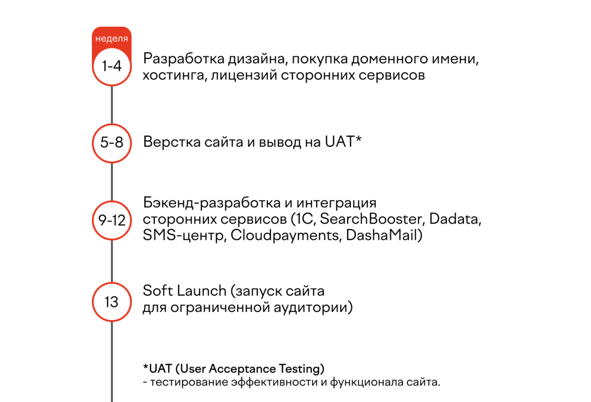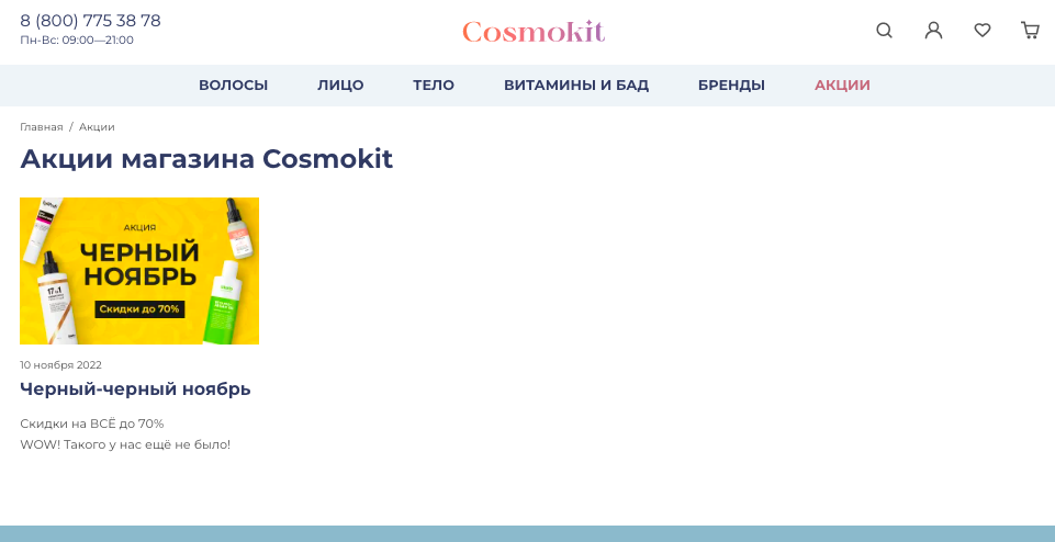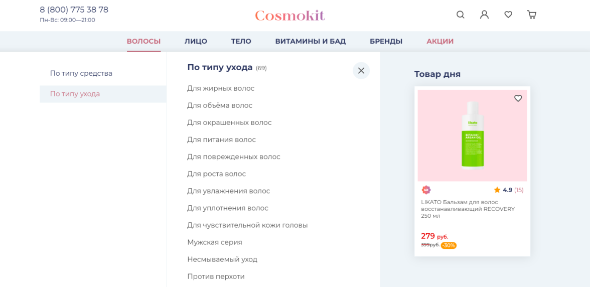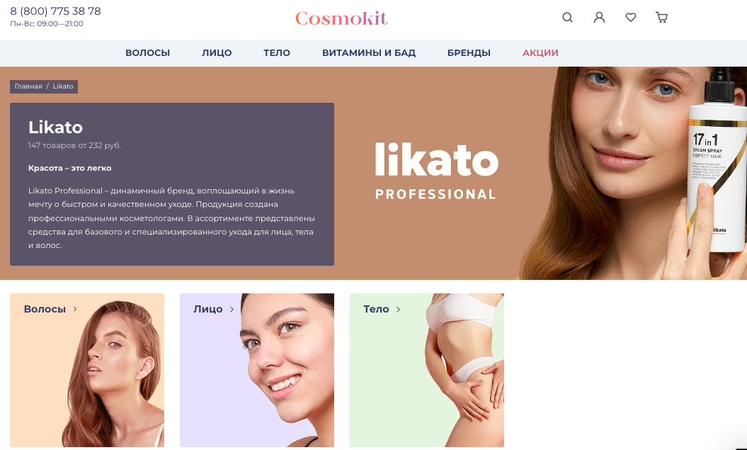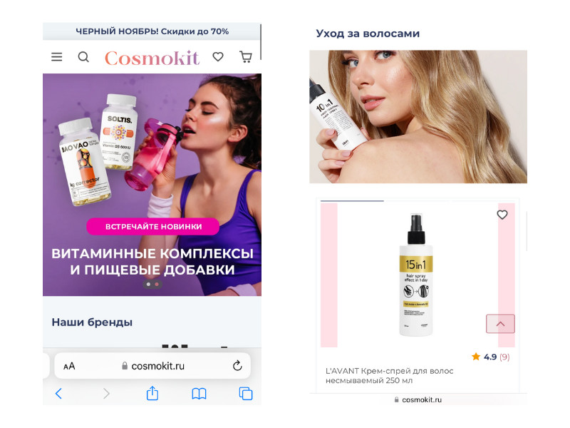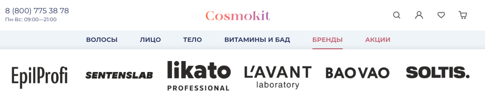 Клиенту было важно разработать сайт за короткий срок — 12 недель, поэтому мы оптимизировали план работ и разделили его на несколько этапов: Чтобы еще один канал продаж клиента был эффективным, он должен быть привычным для пользователя, поэтому разработчикам необходимо делать акцент на удобстве пользования. Изучив целевую аудиторию брендов клиента, — девушки от 16 до 40 лет со средним уровнем дохода — мы сделали сайт, который соответствует ее ожиданиям: схожий с популярными маркетплейсами, простой в использовании и оформлении и ориентацией на стоимость товара (специальные фильтры, раздел «Акции»). Первый экран главной страницы состоит из четырех блоков: Интернет-магазин — инструмент генерации продаж, поэтому еще одним пунктом, на который мы обратили особое внимание, стала разработка каталога товаров. Мы проанализировали каталоги сайтов-конкурентов, вот так выглядит раздел «Волосы» в большинстве крупных магазинов косметики: Мы разделили поиск по продукту и по проблеме. Например, в категории «Волосы» вместо классического списка товаров пользователь может найти продукт по типу средства или по типу ухода. Такое разделение позволит пользователю не потеряться среди множества продуктов, а также в выборе уходового средства отталкиваться от своих потребностей. В дальнейшем с ростом количества продуктов каталог можно настраивать и расширять категории, добавляя новые разделы. Например, «Для сухих волос и чувствительной кожи головы». Еще одна уловка — «товар дня» прямо в выпадающем каталоге. Он нужен для того, чтобы акционной ценой привлечь посетителя, который решил просто «полистать» каталог. В «Товары дня» попадают продукты из раздела «Акции», так товар с уже сниженной ценой становится более привлекательным для пользователя, который ищет продукт в определенном разделе каталога. Эффективность электронной витрины товаров складывается из взаимодействия множества деталей. Ключевые, на которых мы сделали акцент: Нельзя забывать и о брендах. Каким-то пользователям они важны не меньше, чем отдельные средства ухода. По этой причине мы подготовили особый раздел, ведущий на страницы брендов: При переходе на страницу определенного бренда на первом экране представлена основная информация про бренд косметики, а ниже классическое деление на категории товаров. На странице товара — только самое важное. Изображение, видео и текст. Совместно с заказчиком мы обсудили возможность добавления отзывов. Это отличный способ сподвигнуть к покупке сомневающихся пользователей. Мы приняли решение добавить блок с отзывами к каждому товару. После раздела с отзывами мы добавили «Рекомендуемое» — это еще один инструмент допродажи. Мобильную версию сайта мы разрабатывали параллельно с десктопной, чтобы не упустить важные детали функционала сайта. Чтобы увеличить функционал, мы интегрировали сайт со следующими сервисами: Всего за 12 недель мы разработали и запустили интернет-магазин Cosmokit. Помимо поставленных задач мы параллельно реализовали большое количество правок от клиента, а также добавили дополнительные опции, доставка до ПВЗ СДЭК.