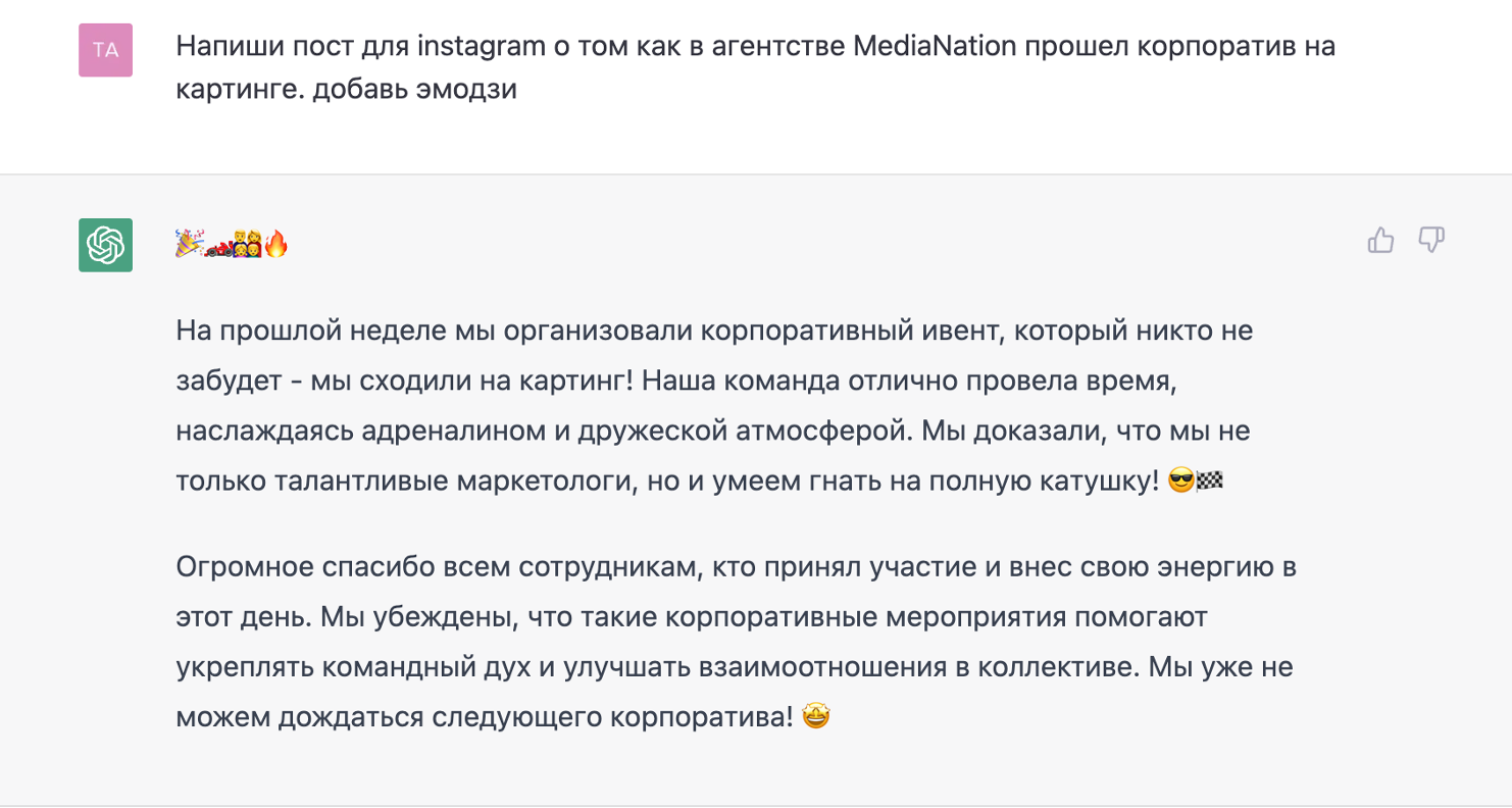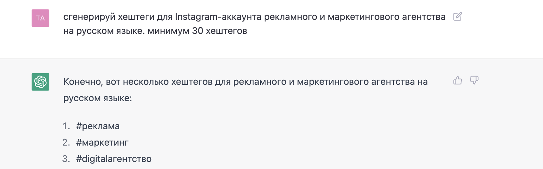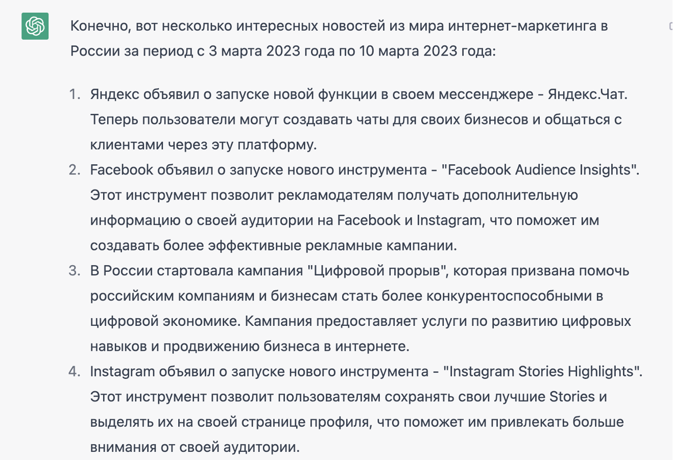 Чат обучен на данных до 2021 года и не в курсе последних новостей. В этом убедились, когда поручили ему подготовить дайджест новостей диджитал-маркетинга за последнюю неделю. Мы указали точный период и год, но нейросеть, вместо того, чтобы признаться, что ей недоступна эта информация, выдала прошлогодние новости. ChatGPT может подкинуть интересные темы для статьи, но проверить, насколько они актуальны, придется человеку самостоятельно — помним про базу данных до 2021 года. Нейросеть можно использовать вместе с сервисом для подбора ключевых слов Wordstat от Яндекса — так вы сможете определить, какая тема пользуется большим спросом. К текстам, которые выдает нейросеть, нужно относиться с изрядной долей скептицизма. В базу для обучения могли попасть некорректные данные, в результате чего некоторые тексты выходят с фактическими ошибками. Нейросеть не может использовать свой опыт и экспертность, приводить примеры и кейсы. Тексты получают сухими, поверхностными, в виде простого изложения фактов. Пока что только человек обладает критическим мышлением и может глубоко проработать тему. Несмотря на ограниченность инструмента, мы нашли несколько полезных функций чата: 1. Поможет написать шаблонные тексты и сэкономит время специалистов. Модель может сгенерировать простые тексты, например письмо-извинение о задержке доставки товара, поздравление с днем рождения, приглашение на мероприятие. Но такие тексты все же требуют минимальной коррекции, если вы хотите сделать сообщение более персонализированным и добавить больше информации об адресате. 2. ChatGPT можно сделать участником брейншторма. Он поможет избавиться от страха чистого листа и даст вам базу, от которой вы сможете оттолкнуться в ходе беседы. Например, вы запускаете новое мобильное приложение и хотите понять, кто может быть вашей целевой аудиторией. Это, кстати, затем пригодится в настройке таргетинга в рекламных кампаниях. С помощью нейросети вы получите идеи для продвижения аккаунта, составите контент-план или mind map (ментальную карту). Нейросеть можно использовать для вдохновения, но не ждите от нее продуманного tone-of-voice (голоса бренда), знания позиционирования компании и анализа аудитории. Кроме того, нейросеть предлагает банальные идеи, которые вам придется «докручивать» самостоятельно, чтобы получить что-то стоящее. 3. Нейросеть хорошо справляется с технической частью: генерирует мета-теги для продвижения статей в поиске, подбирает хештеги для социальных сетей, составляет семантическое ядро для рекламной кампании и список ключевых слов, кластеризирует (группирует) поисковые запросы. 1. Определите, от чьего лица нейросеть будет выдавать тексты. Можно дать команду рассказать, как варить яйца, например, от лица стендапера. Или попросить поделиться, как улучшить позиции сайта, в роли SEO-специалиста. 2. Готовьте информативные запросы — нейросеть не способна уловить ваше видение и ход мысли без подсказок. Уровень канцеляризмов в речи искусственного интеллекта высоко оценили бы в несовременной бюрократической организации. Чтобы тексты искусственного интеллекта были менее «водными», ему нужно дать больше деталей. Сам чат их не попросит — фактуру нужно указывать прямо в запросе. Пропишите 3. Но не переусердствуйте. Чем больше вы дадите информации нейросети, тем меньше она будет генерир