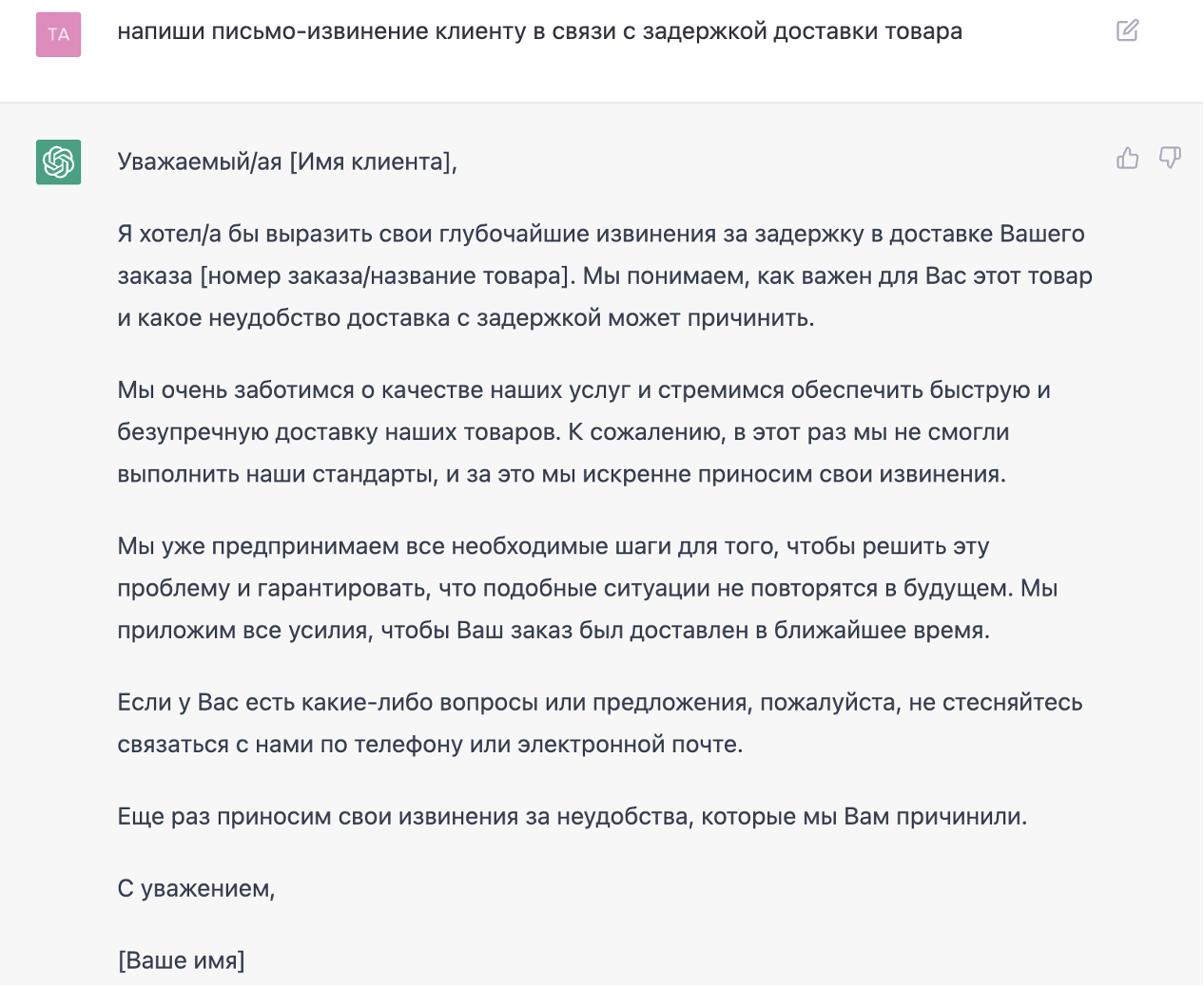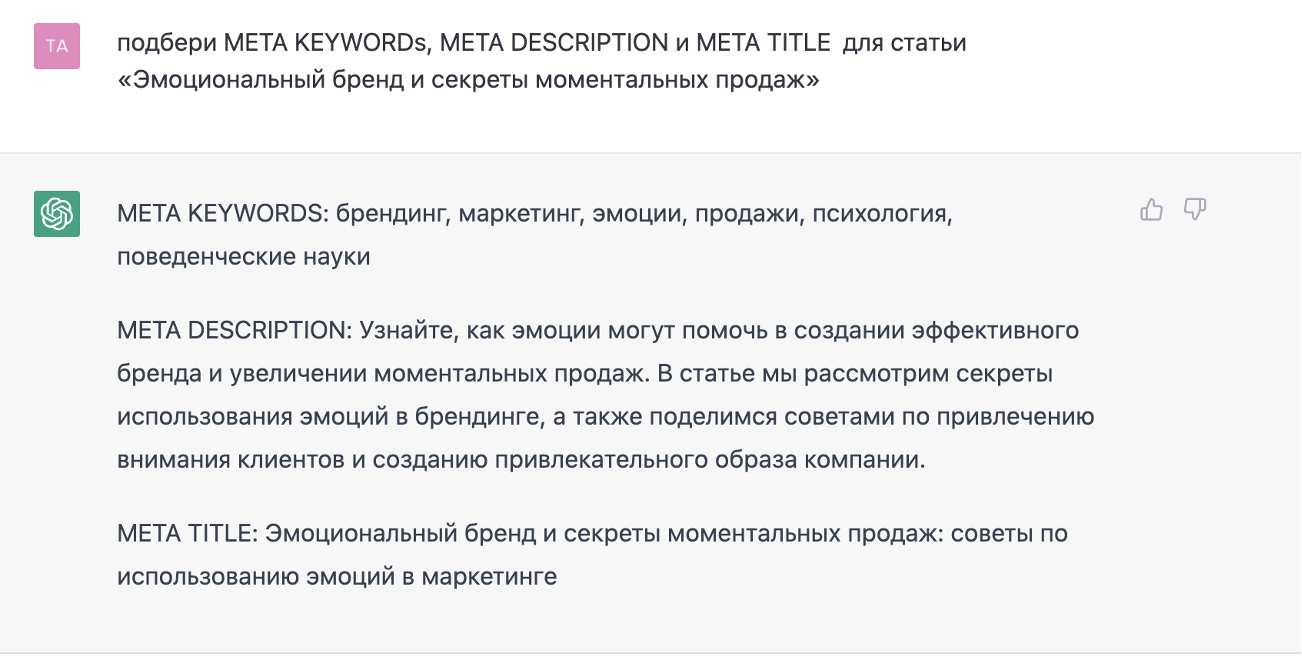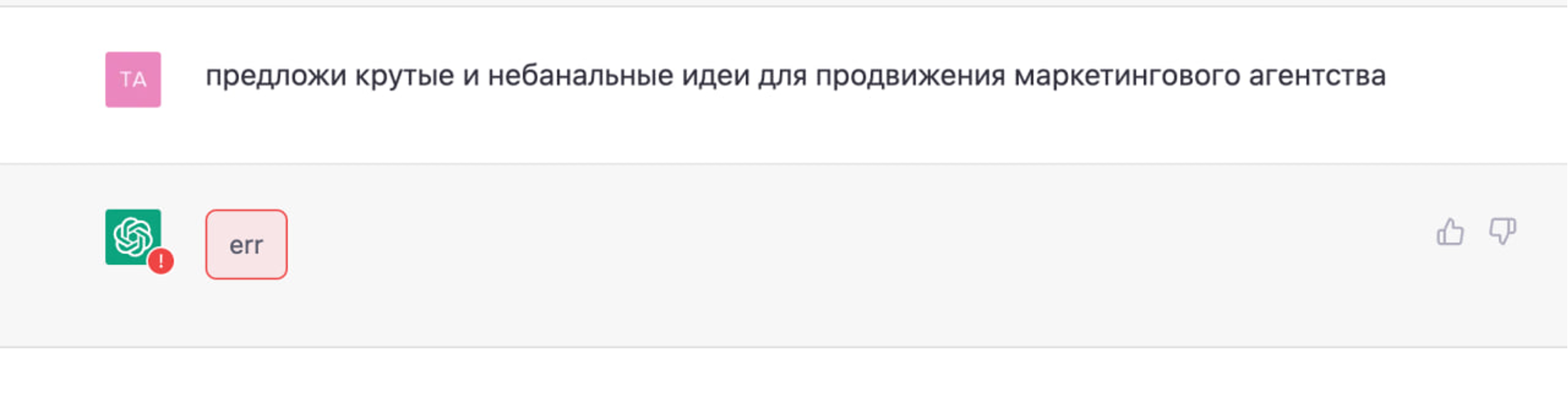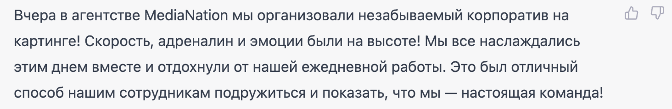 Чат обучен на данных до 2021 года и не в курсе последних новостей. В этом убедились, когда поручили ему подготовить дайджест новостей диджитал-маркетинга за последнюю неделю. Мы указали точный период и год, но нейросеть, вместо того, чтобы признаться, что ей недоступна эта информация, выдала прошлогодние новости. ChatGPT может подкинуть интересные темы для статьи, но проверить, насколько они актуальны, придется человеку самостоятельно — помним про базу данных до 2021 года. Нейросеть можно использовать вместе с сервисом для подбора ключевых слов Wordstat от Яндекса — так вы сможете определить, какая тема пользуется большим спросом. К текстам, которые выдает нейросеть, нужно относиться с изрядной долей скептицизма. В базу для обучения могли попасть некорректные данные, в результате чего некоторые тексты выходят с фактическими ошибками. Нейросеть не может использовать свой опыт и экспертность, приводить примеры и кейсы. Тексты получают сухими, поверхностными, в виде простого изложения фактов. Пока что только человек обладает критическим мышлением и может глубоко проработать тему. Несмотря на ограниченность инструмента, мы нашли несколько полезных функций чата: 1. Поможет написать шаблонные тексты и сэкономит время специалистов. Модель может сгенерировать простые тексты, например письмо-извинение о задержке доставки товара, поздравление с днем рождения, приглашение на мероприятие. Но такие тексты все же требуют минимальной коррекции, если вы хотите сделать сообщение более персонализированным и добавить больше информации об адресате. 2. ChatGPT можно сделать участником брейншторма. Он поможет избавиться от страха чистого листа и даст вам базу, от которой вы сможете оттолкнуться в ходе беседы. Например, вы запускаете новое мобильное приложение и хотите понять, кто может быть вашей целевой аудиторией. Это, кстати, затем пригодится в настройке таргетинга в рекламных кампаниях. С помощью нейросети вы получите идеи для продвижения аккаунта, составите контент-план или mind map (ментальную карту). Нейросеть можно использовать для вдохновения, но не ждите от нее продуманного tone-of-voice (голоса бренда), знания позиционирования компании и анализа аудитории. Кроме того, нейросеть предлагает банальные идеи, которые вам придется «докручивать» самостоятельно, чтобы получить что-то стоящее. 3. Нейросеть хорошо справляется с технической частью: генерирует мета-теги для продвижения статей в поиске, подбирает хештеги для социальных сетей, составляет семантическое ядро для рекламной кампании и список ключевых слов, кластеризирует (группирует) поисковые запросы. 1. Определите, от чьего лица нейросеть будет выдавать тексты. Можно дать команду рассказать, как варить яйца, например, от лица стендапера. Или попросить поделиться, как улучшить позиции сайта, в роли SEO-специалиста. 2. Готовьте информативные запросы — нейросеть не способна уловить ваше видение и ход мысли без подсказок. Уровень канцеляризмов в речи искусственного интеллекта высоко оценили бы в несовременной бюрократической организации. Чтобы тексты искусственного интеллекта были менее «водными», ему нужно дать больше деталей. Сам чат их не попросит — фактуру нужно указывать прямо в запросе. Пропишите 3. Но не переусердствуйте. Чем больше вы дадите информации нейросети, тем меньше она будет генерир