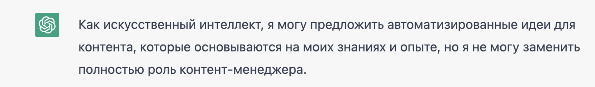 С вопросом «может ли нейросеть заменить контент-маркетолога» все более-менее ясно — сам ChatGPT признался, что не может заменить человека.