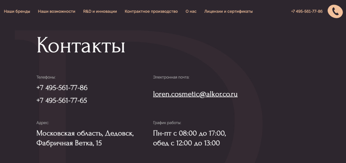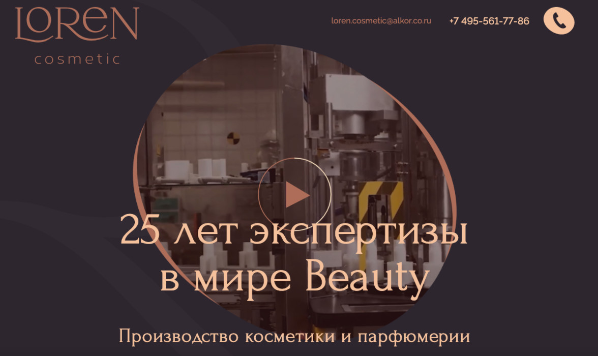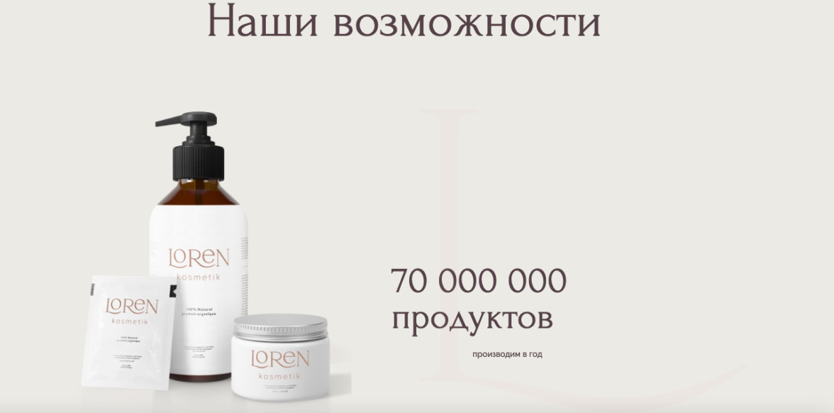 Loren Сosmetic — компания b2b-сегмента, производящая косметику и парфюмерию на протяжении 25 лет. У компании есть как собственные бренды косметики, которые представлены в магазинах Л’этуаль и других торговых сетях, так и контрактное производство. Руководство компании решило увеличить привлекательность компании (производства) для потенциальных бизнес-клиентов с помощью нового сайта и обратилось за его созданием в MediaNation.