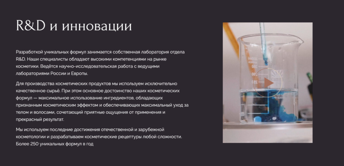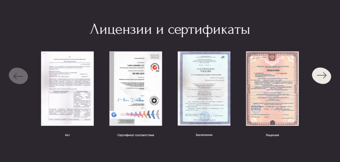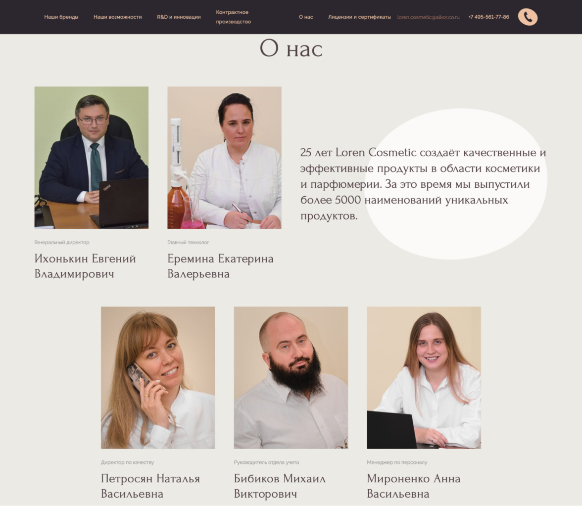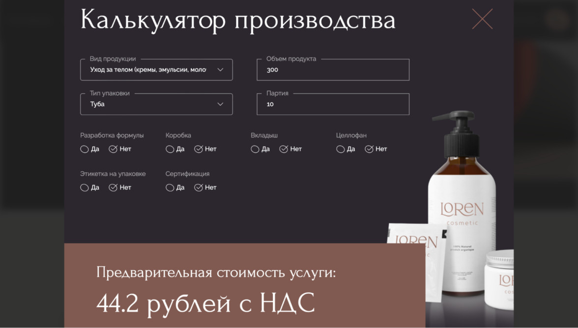 В дизайне сайта мы использовали нейтральные оттенки синего и бежевого цветов, чтобы на их фоне продукция компании и другие части сайта выделялись. В логотипе использовали название бренда Loren в мягком очертании. Изгибы букв напоминают ветви молодых деревьев, что придает бренду свежести и живости, а бежевый цвет ассоциируется с естественностью и натуральностью. Доминирующий цвет на сайте — стальной серый синий. Он отлично сочетается с деталями производства из основного видео на первом экране (синие перчатки работников производства, синяя тара, ультрафиолетовый свет и др.), а также ассоциируется с чистотой и спокойствием. Для создания сайта использовали комфортный для заказчика платформа — CMS 1С-Bitrix. Сотрудники Loren Cosmetics могут в любой момент внести изменения в сайт, так как административная система интуитивно понятная и простая. Нам было важно, чтобы сайт закрывал все потребности целевой аудитории. Расположение экранов сайта мы строили на основе данных из опроса целевой аудитории. На первом экране мы разместили видео с производства, предоставленное клиентом, в котором демонстрируется весь цикл создания продукта — от его разработки до отгрузки в доставку заказчику, а в превью видео мы сделали акцент на 25-летний опыт компании. Потенциальному клиенту важно наличие успешных кейсов, поэтому далее мы разместили самую популярную продукцию, произведенную на фабрике клиента, в формате карусели. При нажатии на товар откроется дополнительная галерея с изображениями всей ассортиментной матрицы. Далее рассказали о возможностях компании — объемах производимой продукции и используемом оборудовании. Оборудованию мы уделили особое внимание, потому что оно играет большую роль в выборе производства. Новые современные станки и полная производственная линия в 20 фотографиях. Подробно расписали этапы производства косметики, чтобы показать отлаженность процессов. Loren cosmetic производит продукцию под собственным брендом, а также разрабатывает формулы для клиентов. Наличие R&D-центра необходимо для тех клиентов, которые находятся только на этапе идеи выпуска собственной продукции. Для владельца бренда косметики также важно, чтобы на производстве был укомплектованный штат сотрудников — надежная команда. Помимо этого, нам было необходимо показать сотрудников на сайте, чтобы у посетителя появилось понимание того, что производство — это в первую очередь люди, а уже во вторую — оборудование, с которым они работают. Изображения людей на сайте также способствует формированию большего доверия аудитории. В B2B сегменте особенно важно показать специалистов, которые принимают решение о сделке. Важно было прописать должности каждого специалиста, чтобы контрагент мог сегментировать сотрудников на «экономических» или "технических".Переход между экранами сделали возможным в закрепленной шапке: Последний экран содержит информацию о лицензиях компании. Особо притязательные контрагенты должны иметь возможность ознакомиться с достижениями компании. На следующем экране — контакты Loren Cosmetics. Один из важнейших блоков на сайте — это конфигуратор расчета стоимости. Мы сделали гибкий и функциональный калькулятор со множеством параметров, с помощью которого посетитель сайта может быстрее прийти к пониманию о необходимости сделки. Оформить заказ чере