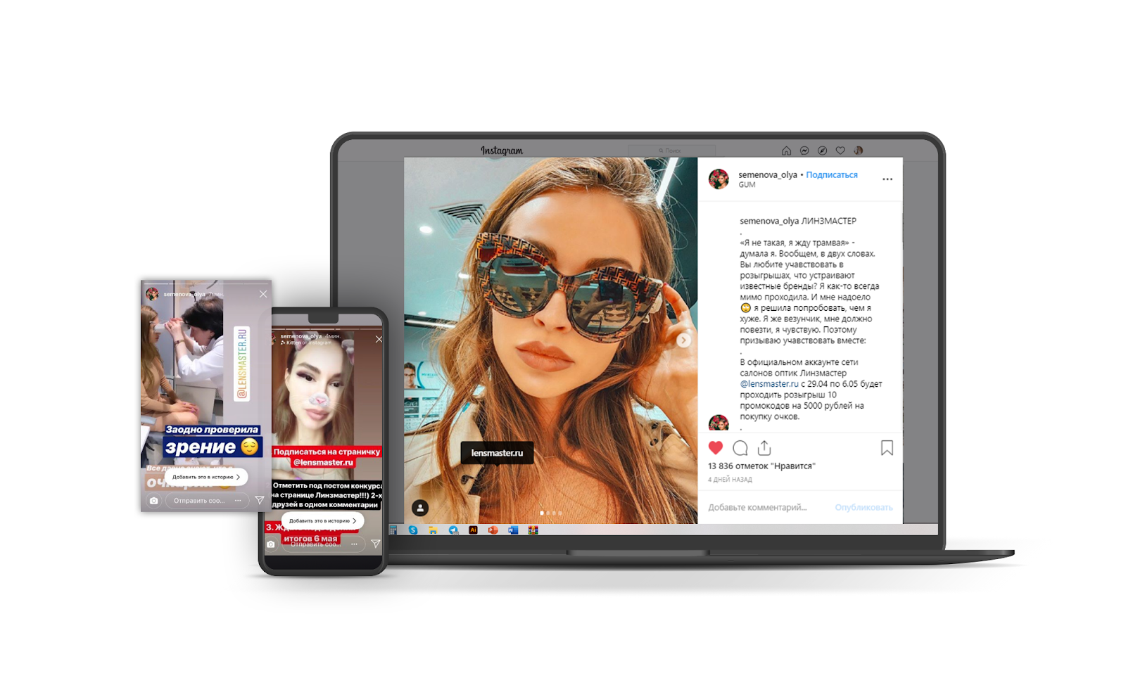Во-первых, компании может попасться недобросовестный блогер. Встречаются ситуации, когда блогер не выпускает рекламу в назначенное время, не делает подводки (либо делает некачественные), не выполняет условия технического задания. Все это может серьезно сказаться на результатах сотрудничества. Во-вторых, рекламодателей отпугивает высокая стоимость подписчика. А вот здесь чаще виноваты сами компании: Основная проблема работы с блогерами, с которой сталкиваются бренды — недостаточное регулирование этой области. Традиционно реклама у блогеров закупалась у инфлюенсера напрямую, через его менеджера или посредством бирж блогеров. Это приводит к тому, что цены на продвижение одних и тех же товаров могут сильно различаться. Кроме того, весь рынок influence-маркетинга держится в основном на доверии и репутации блогеров и брендов. Существуют риски есть как для блогера (заказчик несвоевременно оплатит рекламу), так и для рекламодателя (блогер не опубликует пост или негативно выскажется о бренде). Правда уже в скором времени Instagram планирует взять под контроль этот вид рекламы. Уже сейчас соцсеть тестирует единый маркетплейс для заказа рекламы у инфлюенсеров. Это значит, реклама у блогеров станет вполне регулируемым и прозрачным каналом рекламы. Работа с блогерами на примере компании «Линзмастер» Успешность рекламных кампаний в Instagram определяется, насколько комплексно бренд подходит к работе с блогерами. Перед запуском интеграций важно заранее определиться с задачами, которые должно решить сотрудничество с блогерами. Так при работе с нашим клиентом «Линзмастер» были четко поставлены следующие задачи: Благодаря интеграциям с блогерами, нам удалось охватить более 200 тысяч потенциальных клиентов. При этом количество сохранений рекламных постов превысило 2 тысячи, а количество лайков составило 68 708 (точные цифры вы можете посмотреть в нашем кейсе). Статистика могла быть и не такой радужной, если бы до этого не была проведена комплексная работа. Параллельно с привлечением блогеров для сотрудничества, была запущена таргетированная реклама, а также продуман и проведен розыгрыш промокодов среди подписчиков аккаунта «Линзмастера». Велась работа и с сайтом, на который потенциальные клиенты могли перейти. Обновленный дизайн и функционал стал выглядеть в соответствии с корпоративной айдентикой и соответствовать задачам компании. Клиентам стало проще записаться, просмотреть товары и их наличие. Кроме того, велась работа с социальными сетями клиента: составление контент-плана, ежедневная публикация в Instagram и Facebook, ответы на вопросы и комментарии, приветственная рассылка для новых клиентов. Для создания качественного визуального контента были проведены фотосессии с последующей обработкой в едином стилем оформления. Что проверить перед работой с блогерами Чтобы рекламный бюджет был потрачен эффективно, необходимо провести предварительную работу с потенциально подходящими аккаунтами блогеров. Перед началом сотрудничества важно оценить: Насколько она лояльна, активна, соответствует целевой аудитории компании рекламодателя. Важно проверить, являются ли подписчики живыми людьми или это накрученные цифры. Для получения подробной информации об аккаунте можно запросить статистику напрямую у блогера или обратиться к специальным серв
