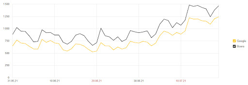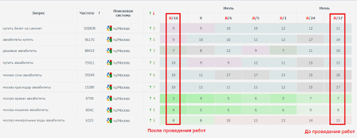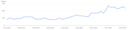 Анализируя позиции сайта по поисковым запросам, мы выявили, что большинство страниц находится в ТОП-30. Это неплохие показатели, которые позволяли при определенной работе над ошибками значительно улучшить позиции сайта. Мы проанализировали, в чем конкуренты превосходят нашего клиента. Оценили структуру сайтов конкурентов, как между собой перелинкованы страницы и какие типы страниц присутствуют на сайте. Также было проанализировано содержание страниц: какие блоки размещены на страницах, какие элементы у конкурентов кликабельны, а какие представлены в виде изображений и схем. На основе расхождений составили список рекомендаций по доработке определенных страниц. Предложили добавить блоки с похожими направлениями, блок с самыми выгодными ценами, графики с динамикой цен по времени и дате вылета, список аэропортов и т.д. Внедрение данных рекомендаций позволило сделать сайт удобнее для пользователей, что в свою очередь положительно повлияло на поведенческие факторы, которые важны для поисковых систем. Для Google важна хорошая структура сайта, чтобы пользователи в несколько кликов могли находить нужную информацию. Кроме того, алгоритмы Google по-прежнему учитывают в ранжировании вес страниц, в связи с чем необходима правильная перелинковка. Поэтому мы сделали следующее: 1. Доработали страницы со списком стран https://www.svyaznoy.travel/land, городов https://www.svyaznoy.travel/cities, авиакомпаний https://www.svyaznoy.travel/aircompany, а также создали страницу со списком направлений https://www.svyaznoy.travel/routes. 2. Организовали перелинковку между данными страницами таким образом, чтобы переход с одной страницы на другую, а также на внутренние страницы был удобен как для пользователей, так и для поисковых систем. Это также положительно сказалось на индексации сайта. 3. Обновили дизайн страниц городов, например https://www.svyaznoy.travel/land/RU/MOW. Новый дизайн был реализован в соответствии с нашими рекомендациями (ранее большинство блоков отсутствовали на сайте). На страницы городов добавили блоки со ссылками на страницы маршрутов, а также разместили график с динамикой цен по дням. 4. Обновили дизайн страниц маршрутов, как на странице https://www.svyaznoy.travel/MOW/SIP. Как и со страницами городов, новый дизайн был реализован с учетом наших рекомендаций: была добавлена динамика цен по времени и дню вылета, блок с аэропортами, прямые рейсы и ссылки на похожие направления. 5. Обновили XML-карту сайта: удалили битые ссылки и ссылки с 301 редиректом, добавили новые страницы со списками городов, маршрутов и стран, например https://www.svyaznoy.travel/routes. В период с 27.05.2021 по 16.07.2021 видимость сайта в Google по направлению «Авиабилеты» выросла с 2% до 11%. Если рассматривать динамику позиций по направлению авиабилетов в Google, можно заметить рост числа запросов в ТОП-10 как по общим группам («купить билет на самолет», «авиабилеты купить»), так и по группам, связанным с маршрутами, например, «москва сочи авиабилеты». Особенно актуально направление «Авиабилеты» стало в период летних отпусков, что привело к росту небрендового трафика и видимости в Google. Если отфильтровать брендовые запросы и трафик на блог в Google Search Console, динамика переходов на сайт выглядит следующим образом: В период с 31.05.2021 по 19.07.2021 небрендовый трафик с Google по направлению «Авиабилеты» вырос с 192 до 596 переходов в сутки. По данным Яндекс.Метрики, поисковый трафик без учета трафика на стра